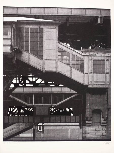 Curator: This is Gerd Winner's "Isle of Dogs II," part of the Tate collection; it depicts a street scene dominated by brick warehouses and overhead walkways. Editor: It’s immediately striking. The oppressive architecture, the muted palette... it evokes a sense of industrial decay and perhaps alienation, reflecting the lived experiences of those who labored there. Curator: Exactly. Winner’s focus on these structures highlights the labor and materials that built London's industry. The repetitive forms speak to mass production and the commodification of space. Editor: And the Isle of Dogs has a rich history of working-class activism and resistance. It became a site of contestation between capital and labor, a microcosm of broader social struggles. Curator: Thinking about the context, you appreciate how the artist transforms ordinary industrial architecture into a monumental statement about work, power, and urban life. Editor: It's a powerful reminder of the human cost of progress, urging us to critically examine the systems that shape our cities and our lives. Curator: A sobering glimpse into the past, prompting reflection on the legacy of industry.