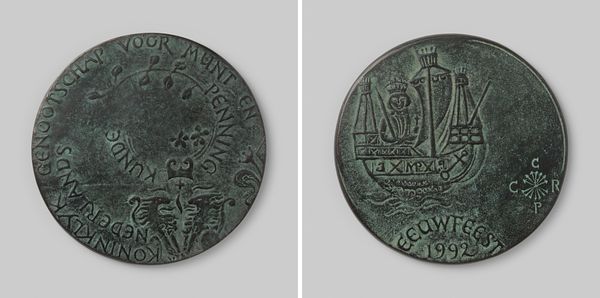 Around 1650 to 1675, this “Amsterdamse Penning” was etched by Bernard Picart, likely commemorating the city's prosperity during the Dutch Golden Age. The print shows two sides of a coin. One side features three female figures, possibly allegories of faith, hope, and charity, or representing the virtues of the city. The inscription around them, "Concors Vis Triga," suggests strength in unity. The other side presents the coat of arms of Amsterdam, held by two lions and topped with a crown, a symbol of sovereignty and civic pride. It is impossible to overlook the historical context of Dutch maritime power and colonial expansion, themes that were frequently romanticized in art. This penning served not only as currency, but also as a tool to solidify a sense of collective identity among Amsterdam’s citizens.