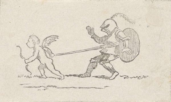 Editor: This etching, "Man Playing a Gridiron like a Violin" by Jacques Callot, depicts a peculiar figure. The man’s got this… almost grotesque form, but he’s holding a gridiron like a violin. It’s absurd, yet there's a sense of performance. What symbols or cultural references do you see at play here? Curator: Notice how Callot uses the exaggerated form. It echoes the Commedia dell'Arte tradition, where stock characters embody specific traits. The gridiron, usually associated with cooking, becomes a symbol of mockery when transformed into a musical instrument. What does that suggest to you about societal roles and expectations? Editor: So, the humor comes from subverting the expected use of objects and roles? Curator: Precisely. By visually dismantling these expectations, Callot invites us to question the established order. It's a potent form of social commentary, using the visual language of symbolism to poke fun at the status quo. I find it fascinating how objects can carry such heavy cultural baggage. Editor: I hadn’t thought of it that way. Thanks; I will definitely look into Commedia dell'Arte.