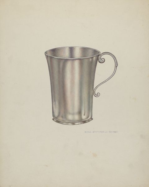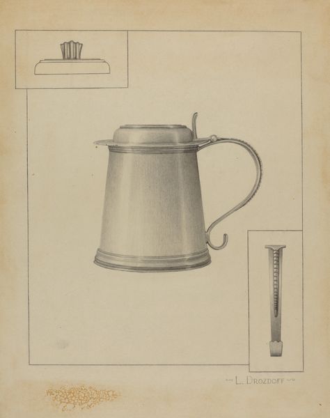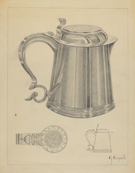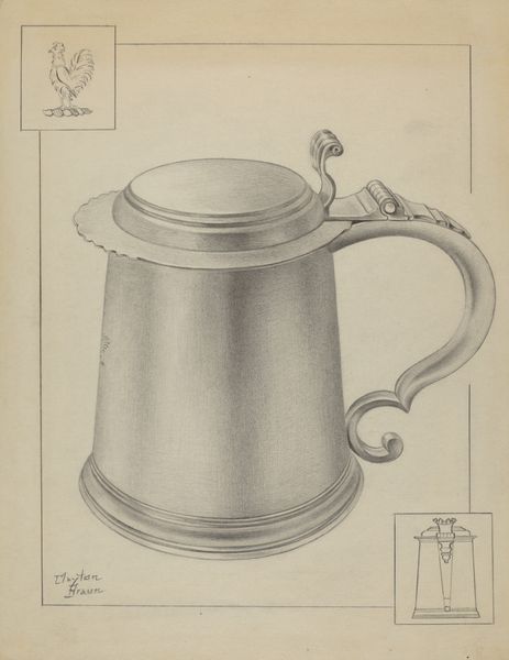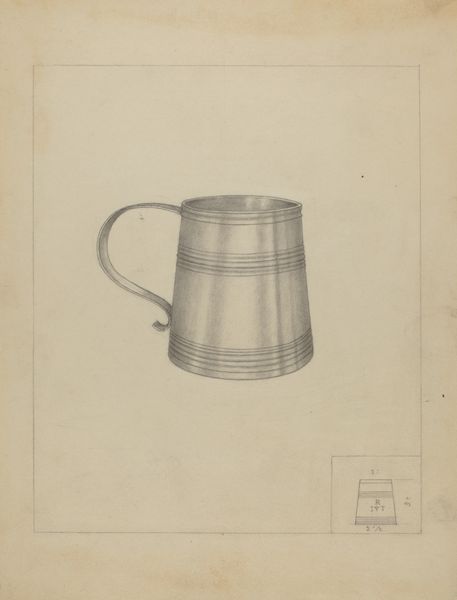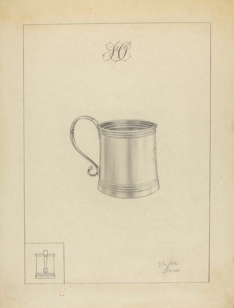 Editor: So, this is "Silver Mug," a pencil drawing on paper, created around 1936 by Horace Reina. It feels…quiet. Almost meditative in its simplicity. The smooth gradients give it a certain depth, despite being a study of, well, a mug. What catches your eye when you look at this piece? Curator: It's the precision, isn’t it? Reina really *saw* this mug. Think about what it means to render silver – how the light dances across its surface. He's chasing that fleeting gleam, the whisper of reflection. He reduces something mundane to line and tone. Did he stop to savour what it represents in his daily life, or was the mug selected simply for being an accessible item? I'd suggest he was attempting to unlock its inherent visual secrets! Editor: That's beautifully put. The way the handle curves – it’s so delicate compared to the solid base. Curator: Yes! It’s a wonderful juxtaposition of line versus volume, function versus form. This feels like more than just an exercise in realism; he is not trying to impress but reflect the intrinsic characteristics, creating space for a bit of magic. What would you use this drawing as if you owned it, as something with which to measure life or just see? Editor: Maybe it’s a prompt to find beauty in the everyday. Now, that little technical drawing in the corner suddenly makes sense—showing measurements! He was concerned with structure and art. Curator: Absolutely. That’s why I keep coming back to this image, to remind myself that elegance doesn’t have to be grand. Simplicity can be profound. Editor: I never thought I’d find a mug so fascinating! This makes me see these subjects with an enlightened mind. Thanks!