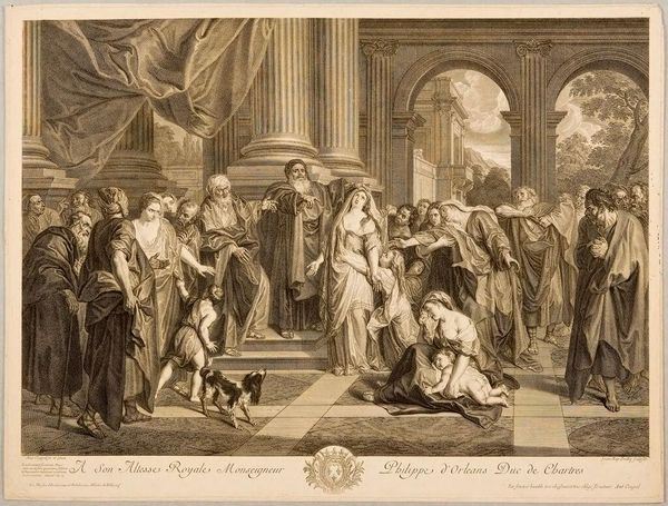 Editor: So, this is "Reception of Poliphilus by Queen Eleutherillida" by Jacques Bouillard. It's a print, and the figures seem posed and arranged, almost like a stage play. What compositional elements stand out to you? Curator: Note the linear perspective, receding into a vanishing point behind the queen. The stark geometry of the architecture contrasts with the drapery of the figures, animating the composition. Do you see how Bouillard creates depth? Editor: Yes, the use of light and shadow is very subtle but effective. It directs our eyes toward the queen. I also see how he uses lines to create the different textures of the materials. Curator: Exactly. The lines articulate the form of the figures and architectural space. The overall effect is a carefully constructed visual narrative. Editor: This has given me a new appreciation for how much can be conveyed through line and form. Curator: Indeed, Bouillard masterfully uses formal elements to tell a story.