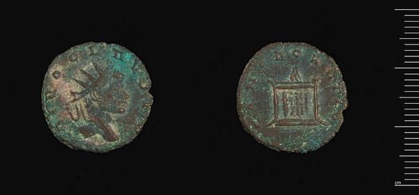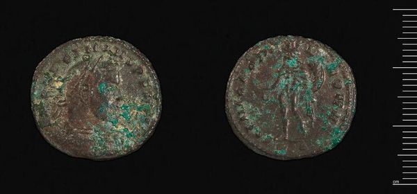 Curator: This is a coin of Licinius, struck in Alexandria, which weighs just 2.65 grams. Editor: It’s incredible that something so small can carry so much weight – both literally and figuratively. Its aged green patina speaks volumes. Curator: Absolutely. Its materiality hints at the complex dynamics of the Tetrarchy. Licinius's reign reflects the power struggles and betrayals inherent in that political structure. Editor: And what about the figure on the reverse? Is that a deity? What would its symbolism have meant to the people using this coin? Curator: Most likely a depiction of Jupiter, carrying the scepter and thunderbolt, asserting Licinius' divine right to rule within a specific cultural and religious landscape. Editor: The coin’s very existence challenges modern notions of national identity. It shows how power and belief were communicated in a pre-digital age. Curator: Precisely. This coin offers a window into the multifaceted and often contradictory nature of imperial authority. Editor: It’s a reminder that even small, everyday objects are embedded with historical context and layers of meaning.