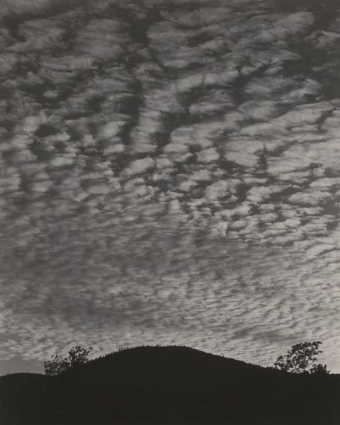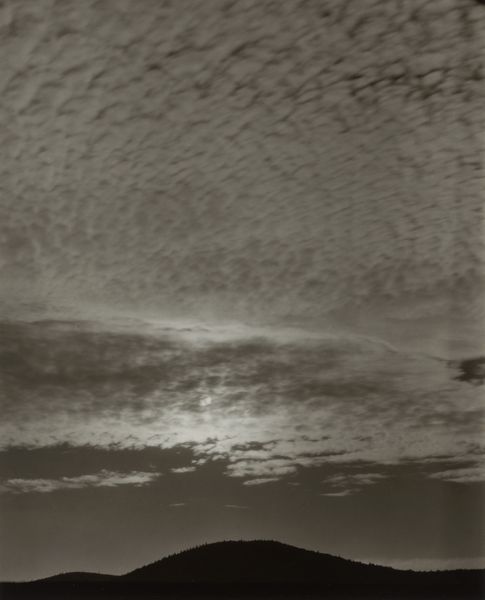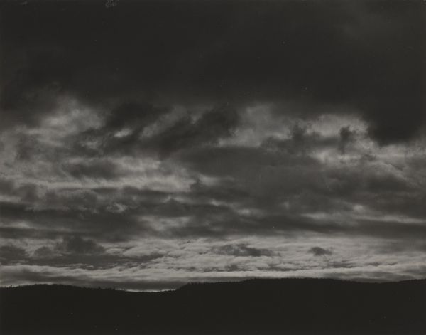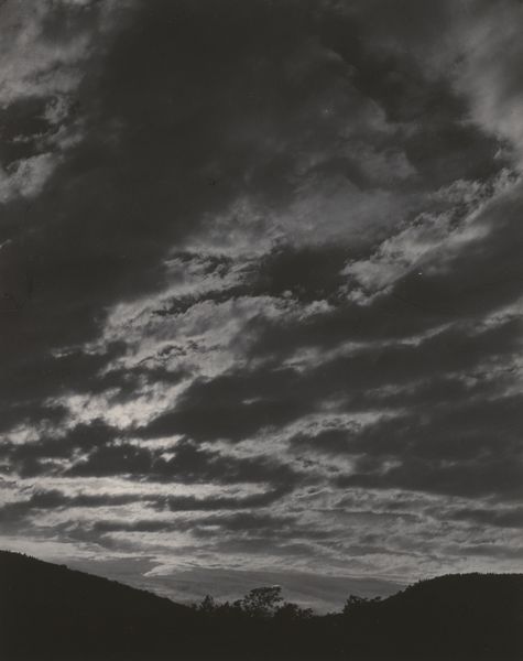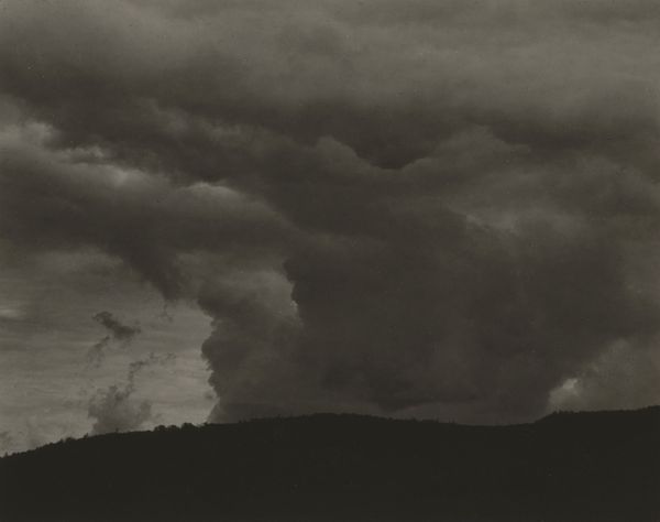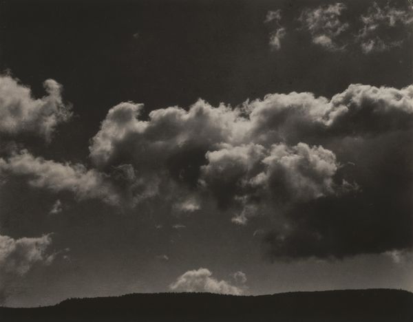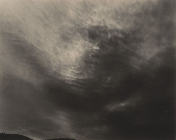 This photograph, "Lake George", was made by Alfred Stieglitz with silver. It's a moody piece; the palette is muted, a study in greys. Look at how Stieglitz coaxes such drama out of the sky. The clouds aren’t just clouds; they're like thick brushstrokes, swirling with an energy that feels both turbulent and strangely serene. There's a tension in the way the light catches the edges of the clouds, almost like he’s sculpting them with shadows. The dark mass of trees below sits in contrast with the lightness of the sky. See how Stieglitz has captured the texture of the foliage. It's as if he's inviting us to contemplate the interconnectedness of earth and sky, and to question our place within it. The tonal qualities remind me of Gerhard Richter’s grey paintings. Both encourage us to see the world anew.