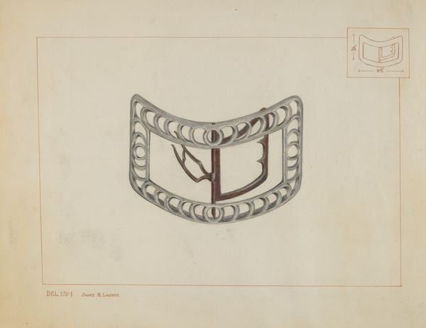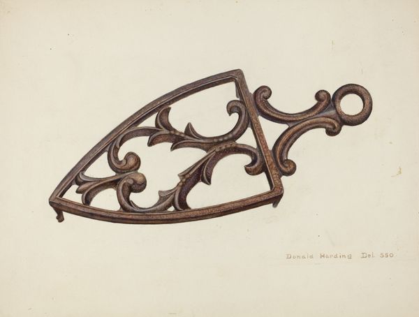 Curator: Here we have Verna Tallman’s "Hinge," a drawing created around 1937, likely with metal and paper. It offers an elegant depiction of a functional object. Editor: It has such intricate flourishes! My initial impression is one of almost baroque extravagance, but grounded in the reality of a working hinge. The contrast is intriguing. Curator: Indeed. What seems remarkable is that the artist chose to represent an object so common in daily life. We often overlook the design and craft embedded in even the most functional pieces. Perhaps she aimed to elevate the everyday into the realm of art, reflecting the Arts and Crafts movement's ideals. Editor: The careful rendering, the detail given to the scrolling forms, it speaks of close observation and meticulous craftsmanship. Note the subtle gradations of light across the metal's surface, conveying volume and texture. The negative space, created by those curls, is as important as the metal itself, forming complex, visually arresting shapes. Curator: Tallman worked with the Index of American Design, which sought to document and preserve the folk art traditions of the United States. These illustrations served a public purpose: a cultural inventory during a time of social upheaval and economic depression, asserting a national artistic identity rooted in vernacular traditions. Editor: So it is simultaneously utilitarian and aesthetic. The image embodies form following function, with embellishment almost fighting with it. Are these scrolls practical at all, or entirely decorative? Curator: Good question! The decorative elements may reflect regional aesthetics. It's interesting to consider the cultural values expressed through even seemingly insignificant hardware, suggesting how deeply design permeates every aspect of our material environment. Editor: Seeing it now, I better appreciate the artist’s selection of an object generally perceived as mundane. It forces one to reconsider those little unnoticed things and acknowledge their aesthetic possibilities. Curator: I agree. Looking closely at this, it changes one’s awareness, demonstrating art's power in directing how we look at familiar things.