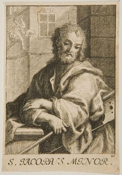 Editor: So this is Cornelis Visscher's "Saint Luke," a drawing from around 1650, rendered in pen, ink, graphite and charcoal on paper. The detail is pretty amazing for such a small work. I am struck by the rather direct gaze. How do you read this image? Curator: I see a portrait steeped in the visual language of its time, yes, but also a potent statement about the act of creation itself. This isn't just St. Luke; it's a representation of authorship, shaped by prevailing religious and social doctrines. Consider the ox behind him—the symbol of St. Luke—reduced to a supporting role while the *man* takes center stage. Editor: That’s an interesting point. So it’s about authorship as a power dynamic? Curator: Precisely. The halo, the book, the instruments of writing, all serve to legitimize and elevate St. Luke’s role, but let's not forget the layers of interpretation that have been imposed upon this image throughout history. How might a feminist reading of this work challenge the singular authority it portrays? Editor: Perhaps by questioning the traditional male-dominated narrative of artistic and religious creation, right? Curator: Exactly! The very idea of a divinely inspired "author" needs to be unpacked. Visscher's Saint Luke offers a lens through which to examine not just art history, but the construction of knowledge and power itself. This Saint Luke raises complex questions regarding gendered creative labor, class structures, and their entanglements within religious narratives of early modernity. What was not apparent at first viewing suddenly presents critical discourses when approaching art history through interdisciplinary analysis. Editor: This makes me see the artwork through an entirely new context. Thanks. Curator: My pleasure. These dialogues between past and present are crucial to our understanding.