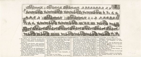 Editor: This is Jacobus Buys’ "Funeral Procession of Willem IV, Prince of Orange," made in 1752. It’s a print using ink on paper. The procession unfolds in horizontal bands. The sheer number of figures and the detailed rendering of each carriage really strike me. What do you see in this piece, focusing on its formal qualities? Curator: The work is striking in its organisation. Note the deployment of horizontal bands across the visual field; a hierarchical layering effect emerges through the distinct articulation of space, even without relying on conventional perspective. How does this rigid structuring influence the viewing experience, do you think? Editor: It makes it feel very formal and controlled, almost like a record or diagram more than a dynamic depiction. But why this insistent linearity rather than, say, a more illusionistic depiction? Curator: Exactly. Consider the composition of shapes and the stark contrasts between dark and light; these render depth. The emphasis shifts away from representing three-dimensional reality and centers the eye on the two-dimensional picture plane. It serves as an inventory or taxonomy of elements in the parade, rather than a rendering of reality. We have almost no spatial depth in any band, allowing the viewer to isolate the elements in that portion of the ceremony. Do you see how the details contribute to a flattening of the image? Editor: Now I see how each horizontal band works almost independently from each other. I hadn’t considered that the flatness emphasized the procession’s details instead of its setting. Curator: Precision over illusion, contributing to its character. Ultimately, this artwork highlights the formal arrangement and design over accurate visual representation. What started as perhaps a straightforward illustration contains many other intricate aesthetic choices.
