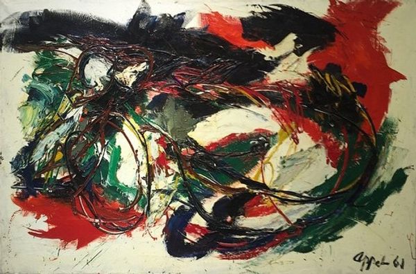 Editor: Here we have Romul Nutiu's "Configuration" from 1988, rendered in acrylic. The blue background really sets off the furious, chaotic lines – it feels almost like looking at the exposed nerves of a raw emotion. What do you make of this work? Curator: It strikes me as a furious, internal landscape. A territory not of geography, but of the mind. You mentioned the exposed nerves; I think of a tangled undergrowth, bursting with raw energy, fighting for space. Almost as if Nutiu is wrestling with his own thoughts and feelings, externalizing this struggle for us to witness. Does it feel claustrophobic to you, or liberating in its expression? Editor: I definitely see the claustrophobia, but the vibrant colours hint at liberation. So much tension! Do you think there’s any influence of Abstract Expressionism in his work? Curator: Absolutely, especially that visceral, spontaneous gesture, that desire to access and record the subconscious… reminiscent of Pollock’s drips, perhaps? Though, Nutiu seems less about the accident, more about channeling raw, intentional energy through each frenetic line. But tell me, do you find any specific form emerging from this supposed chaos? Editor: I can make out the suggestion of a figure, almost ghostly, struggling amidst the lines. Or perhaps I’m just trying to make sense of it all. Curator: Isn't that the beauty of abstraction? It’s a mirror. Nutiu gives us the vocabulary, but we supply the story, pulled from our own experiences, fears, and hopes. It’s less about what Nutiu intended and more about what the work awakens in you, standing right here, right now. Editor: It is kind of like staring into the void. I think I came in with a preconception about abstract art but now understand that the chaos on the surface can evoke emotions as intense as anything representational. Curator: Precisely! And remember, even chaos has its own inherent order, a secret language waiting to be deciphered. Or, perhaps, felt.