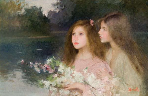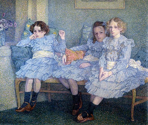 Editor: James Jebusa Shannon's *Jungle Tales*, which he painted sometime between 1862 and 1923 using oil paint, really evokes a feeling of cozy intimacy. What first strikes you about it? Curator: It's interesting that you say "cozy," because, despite the seemingly peaceful scene of storytelling, I see a subtle unease conveyed through symbols. The golden floral patterns behind them, are they merely decorative or are they suggesting an idealized past, perhaps one that is fading? Editor: That's a fascinating point! I was focused on the domestic setting. Is that contrast intentional, do you think? Curator: Absolutely, I think the artist deliberately creates tension between the comfortable and the symbolic. Note the mother figure, obscured and almost faceless, contrasted against the sharply rendered features of the children. Could this be Shannon questioning the roles, perhaps the potential repression, within domestic life at the time? Editor: So, you're saying it is a subversion of typical Victorian ideals, maybe about feminine roles in society. Curator: Precisely. Look, too, at the averted gaze of the child in the center. It's as if she is seeing something we can't, maybe sensing that idealized "jungle tale" for what it is: a comforting lie. Do you see that symbolism, and does it speak to you on some deeper level? Editor: I definitely see that now. I had assumed it was just a nice scene, but it’s clearly loaded with more complex emotions. It feels both intimate and, as you said, a little unsettling. I will always view things more closely. Thank you! Curator: And I find renewed appreciation for the artist's subtle skill in weaving these visual narratives through carefully chosen imagery.