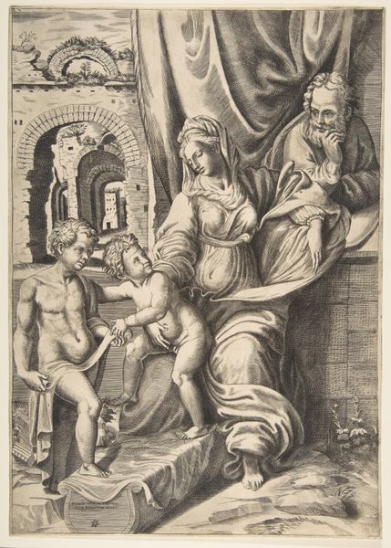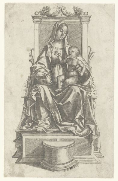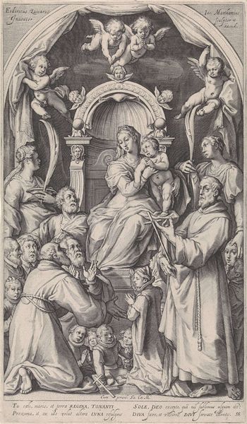 Editor: Here we have Girolamo Mocetto’s engraving, “Maria met kind zittend op een troon tussen Petrus en Johannes de Doper met musicerende engelen en drie vrouwelijke heiligen op de achtergrond,” created sometime between 1480 and 1531. It’s amazing how much detail he packed into a print. What stands out to you the most when you look at this artwork? Curator: The very process of its creation speaks volumes. Think of the labor involved in engraving that level of detail onto a plate, the physicality of the artistic act. What does it mean to take a traditionally painted subject and reproduce it via printmaking during the Renaissance? Editor: I suppose it allowed for wider distribution, making it more accessible to a larger audience, perhaps those who couldn't afford original paintings? Curator: Exactly! It disrupts the idea of the unique, precious artwork. Printmaking enabled mass production, making religious imagery—and the ideology it carries—a commodity. Consider the materials: the paper, the ink, the metal plate. Where did they come from? Who processed them? The answers reveal complex trade routes and social structures. And note that within the composition, you see several other technologies deployed to support religion and the state. Editor: I never really thought about prints in that light, focusing on the production itself instead of just the image. I guess I was only really considering the artistry. Curator: The artistry is inseparable from the means of its production. This piece prompts us to consider the Renaissance not just as a flowering of individual genius, but also as a complex network of labor, materials, and consumption. What kind of statements can be inferred by Mocetto displaying the materials he deployed so overtly in the end-result? Editor: That’s a totally different perspective. I am always so used to consider the composition but I will definitely think about that more from now on! Thanks!