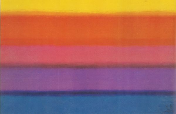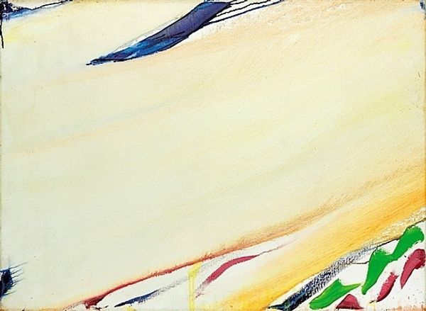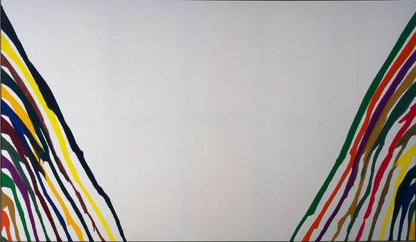 Curator: This is “K S I,” an acrylic on canvas painting by Morris Louis from 1959. It’s currently held at the Folkwang Museum in Essen. What are your initial thoughts? Editor: Well, it's undeniably striking. The stark whiteness, contrasted by those vibrant, cascading ribbons of color, it's as if rainbows are weeping onto the canvas. There's a somber quality mixed with undeniable energy. Curator: I appreciate your reading of that emotional tension. Formally, the "Unfurleds," as Louis termed this subset of his Color Field works, depend heavily on the sheer optical impact of color. The raw canvas isn't just a background; it’s an active element, structured around a kind of controlled pour. Editor: Controlled, perhaps, but the drips themselves evoke a sense of the uncontrolled, almost a letting go. The 'weeping rainbow' effect carries connotations of mourning, or perhaps a letting go of something cherished. There is a vulnerability, as if what has been meticulously crafted threatens to come undone. Curator: That friction is critical. Think of Louis’s engagement with Clement Greenberg's theories—pushing flatness, celebrating the unique qualities of paint on canvas. The canvas is stained, not painted in the traditional sense. This allows the colors to merge with the weave of the fabric. Editor: It creates a spectral quality. This stain technique, to me, is less about celebrating flatness and more about transcending the physical limitations of the canvas itself. It's almost spiritual; a yearning for something beyond the material. The convergence and near touching of the colours gives this abstract work an unexpected feeling of closure. Curator: Precisely. Though the imagery is purely non-representational, the interaction of these formal elements is still designed to stir emotion. There is a clear awareness of compositional balance in play, the symmetry achieved by opposing the streams, as well as the visual 'weight' or dominance asserted on both edges of the art work. Editor: And the choice to leave the center largely untouched pulls the eye in. You are initially drawn to the boundaries then are pushed inward towards that almost holy central light, suggesting transformation through chromatic catharsis. It’s more than just the visual qualities; it evokes a real sense of catharsis. Curator: An insightful reading, particularly in the way that you synthesise these formal and interpretive threads. I think you've shone light on the intrinsic emotional content embedded in Louis' technique. Editor: And you’ve clarified the revolutionary artistic ambition and structural strategy at the core of this work.