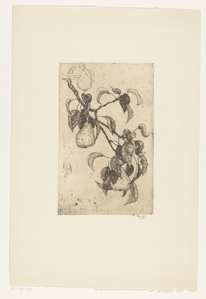 Curator: We’re looking at “Vaas met tulpen,” or “Vase with Tulips,” a print by Barbara Elisabeth van Houten. Its date is estimated between 1872 and 1950. The media used include etching and paper. Editor: It has a melancholy sort of beauty. The etching creates this lovely hazy texture, a little blurred around the edges. They seem like ghosts of tulips, really. Curator: Yes, that visual texture arises from the process itself, the controlled corrosion of the metal plate... We can see how line work and tone interact here, a hallmark of Van Houten’s commitment to the graphic arts. It's interesting how she merges the traditions of fine art and printmaking, inviting a reflection on art’s reproductive nature. Editor: It definitely leans into the print's potential for shadow and subtlety. There's a stark contrast between the very dark tulip on the left and those almost translucent blooms on the right. Like they're catching their last light. Curator: You’re responding to a key element: the use of chiaroscuro, the treatment of light and dark. Etching, as a replicable process, democratized image production and shifted how the 19th and early 20th-century Dutch consumed visual information. Prints brought art to a broader audience, influencing taste, and potentially, social discourse. Editor: Makes you think about who owned this, hung it on their wall. Maybe they loved gardens, maybe it reminded them of a loved one… it whispers of something lost, somehow. The texture alone speaks volumes; you can practically feel the rough quality of the paper beneath your fingers. Curator: Indeed. Van Houten worked in a period when etching underwent a significant revival. We can observe an increased interest in the craft and artistry. Prints allowed artists to explore detail and depth using methods different from those available through drawing or painting. Editor: What a journey for those humble tulips. Starting in a garden, then translated to metal, etched by acid, pressed onto paper, and now, centuries later, whispering secrets to us. Curator: A story etched in material. The etching is an index, pointing to layers of production and meaning. Editor: A little floral poem, penned in acid.