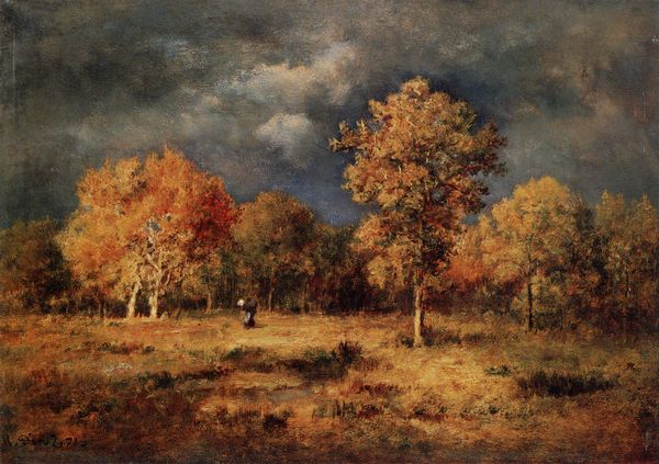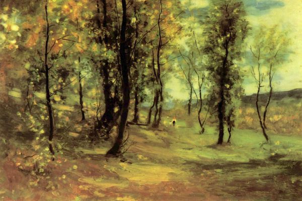 Willard Metcalf’s "The Picnic" is a painting, location and date unknown, that captures an intimate scene of leisure with oil on canvas. Look at how Metcalf builds up the scene with layers of brushstrokes, creating a mosaic of autumnal hues. The texture is quite varied, some areas thickly impastoed, others thinly glazed. Notice the way the light filters through the trees. It's not just about depicting leaves and branches, but about conveying the feeling of being enveloped by nature. The way Metcalf layers browns, oranges, and greens, it reminds me a little of Corot, but with a more American sensibility. Both artists use a similar tonalist approach, creating atmospheric depth through subtle shifts in color. Like any good painting, "The Picnic" invites us to pause, to look closely, and to get lost in its layers of meaning and sensation.