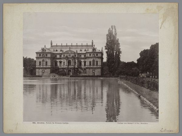 Curator: This albumen print, likely created between 1875 and 1900, offers a glimpse of Kasteel Biljoen in Velp through the lens of Johannes Gerardus Kramer. It's titled "Gezicht op Kasteel Biljoen te Velp." Editor: It strikes me as a photograph steeped in quietude, almost melancholic. The muted tones lend a sense of timelessness, while the castle’s reflection shimmering in the water doubles the architectural weight. Curator: Indeed. The photographic process of the time, coupled with Kramer's composition, positions the castle as a stately landmark within a rapidly industrializing Netherlands. These images played a role in solidifying a sense of national identity through the preservation of such historic locations. Editor: Do you think this idealized vision, deliberately framing the castle apart from broader societal issues, papers over socio-economic inequalities? Focusing on such grandeur might obscure the lives of those working on and around the estate, who, surely, were affected by industrial progress too. Curator: It’s a fair point. Landscapes like this can sanitize reality. However, we can still explore its significance. Photography became increasingly accessible, shifting documentation and allowing diverse hands in visual narratives. Think about the growing middle class being able to picture what aristocracy looked like. Editor: Access is key! Even with its aesthetic distance, one can acknowledge that photography democratized how we understand our place within class, race, and gender hierarchies. Its mass production allows it to engage people in discussions about how the story of “progress” often conveniently leaves people behind. It would be fruitful to examine how people of that time used or consumed pictures such as these to better assess their true implications in society. Curator: Absolutely. Thinking about context adds significant nuance. This image can offer both the aesthetic preservation of place and also, prompt critical investigations. Editor: Precisely! It invites us to examine representation itself and the inherent power structures embedded within. Perhaps we ought to consider not just what's pictured but what deliberately remains unseen.