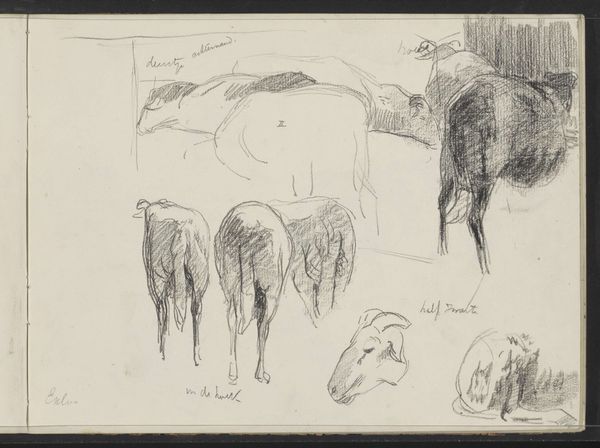 Editor: Here we have Ferdinand Oldewelt's "Liggende schapen te Exloo," created around 1904 to 1912, employing both pencil and ink on paper. There's a quiet, almost meditative quality to it, despite being a fairly simple sketch of sheep. How do you interpret this work from a formal perspective? Curator: Well, focusing solely on its intrinsic properties, note the stark contrast created by the layering of pencil and ink. Oldewelt uses line weight variations, a key structural component. Observe how the thicker, darker lines define the sheep closest to us, pulling them forward, while lighter pencil strokes create a sense of depth. What strikes you about the composition itself? Editor: The placement of the sheep, almost like stacked forms, leads your eye around the page in a circular motion. Is that deliberate, do you think? Curator: The rhythm, I propose, originates in how Oldewelt arranges the sheep to generate visual equilibrium. Consider the subtle geometry: the horizontal lines of the ground against the rounded forms of the sheep. It introduces tension and resolution simultaneously. Notice also the contrast of negative and positive space. The unworked areas around the forms enhance the solidity of the resting animals. Editor: I see it now; it's a rather deliberate construction, even for what seems like a quick sketch. The stark contrast definitely gives it an interesting weight. Curator: Indeed. The interaction of these elements—line, tone, composition—construct the drawing's internal logic and communicate meaning independent of its subject matter. What does contemplating its form contribute to your comprehension of Oldewelt's vision? Editor: It makes me appreciate the artistic choices behind representing a simple pastoral scene, that the artist’s intentions with lines and shades really determine the emotion in this drawing. Curator: Precisely! The work stands as a testament to the communicative power inherent in form itself, a pure manifestation of artistic intention.
