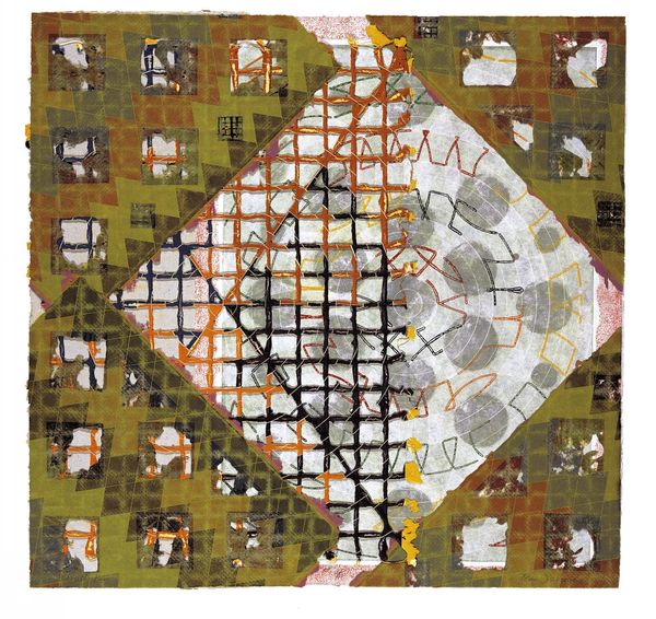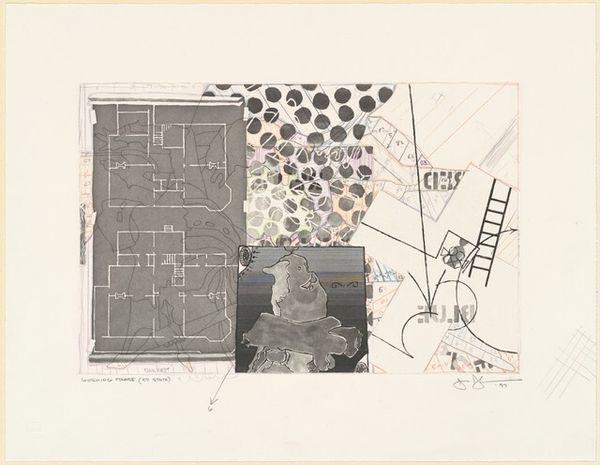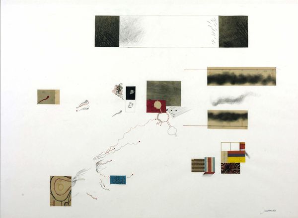 Editor: So, this is Bernard Cohen's "Matter of Identity I," created in 1963. It's a mixed-media painting, and what strikes me most is the almost diagrammatic feel, with all the different sections and connecting lines. What’s your take on it? Curator: What interests me immediately is Cohen's apparent obsession with the act of making. Note the use of mixed media. It’s not just about the image, but also about the *process* of image-making laid bare. Think about the period - early 60s - a real questioning of artistic tradition, particularly regarding what is "high art" versus craft. Editor: So, you're saying the *how* is as important as the *what*? The mixed media is him challenging artistic norms? Curator: Exactly! Look at the repetitive geometric patterns and the linear networks overlaid on the various painted sections. It hints at mass production, almost an embrace of the industrial era but done by hand. Consider what this piece suggests about the artist’s labour - it challenges our ideas about skill and individual artistry, doesn't it? Does this resonate with post-war Britain to you? Editor: I see that, yes. It feels like he’s dismantling the idea of the artist as this singular genius, in favour of a more constructed, almost engineered approach. Curator: And this construction mirrors societal structures and control, through labour and materiality. The individual elements don't function independently; they're tied to the system. Does thinking about that idea shift your view of it now? Editor: Absolutely. I initially saw a somewhat chaotic composition, but now I appreciate how deliberately Cohen uses the materials and the grid to examine something much bigger, not just within the art world. Curator: Indeed, this work asks us to reconsider value - not just the aesthetic value of the artwork itself, but also the value we place on materials, production, and even the artist’s role. Editor: This has totally changed my understanding. It is not chaos but about a controlled study of what it means to make. Thanks for sharing that with me!