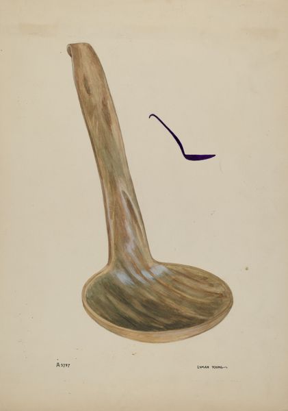 Editor: This is Frank Fumagalli’s "Button Hook," created around 1938, using watercolor and drawing techniques. It feels incredibly simple and yet quite elegant, with this single tool centered on the page. As you look at it, what stands out to you? Curator: It is deceptively simple, isn’t it? A button hook—an almost archaic tool. Consider its function: to fasten buttons, often on garments worn close to the body. What does it signify about privacy, or the ritual of dressing? This wasn't clothing someone throws on. There was almost a level of intimate care necessary. Editor: So the tool itself represents a specific type of care and intimacy that maybe we've lost. Curator: Exactly! It’s a powerful, and understated, symbol of a bygone era. The artist chose to portray it isolated, almost as a relic, drawn with precision. Even the colour – muted purple – evokes a certain nostalgia. Do you see the elongated shape as symbolic? Editor: Now that you mention it, it does resemble certain wands and ritualistic objects... even a scepter. It suggests a transfer of power. In the everyday application, someone used that tool to carefully assume control of their own appearance, of their presentation to the outside world. Curator: Precisely. It’s the tool's former importance, distilled and amplified. It serves as a visual echo to what would become commonplace practices that perhaps required less active self-mediation, less consideration and preparation for one's place in society. What would a drawing of this mean to someone living through the Great Depression, I wonder? Editor: This really highlights how something as mundane as a tool can become a vessel of cultural memory. Thanks for the deep dive! Curator: My pleasure. It reminds us to see past the surface.