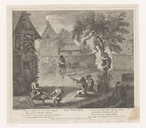 Editor: So, here we have "Drinkende en dansende apen," or "Drinking and Dancing Apes," an engraving by Louis Le Mire, sometime between 1738 and 1757. It's quite playful, but what strikes me is how the artist has depicted the apes almost as caricatures of humans. What do you see in this piece, beyond the obvious humour? Curator: As a materialist, my eye is drawn to the process of printmaking itself. Look at the lines, the density of hatching, the way the image is constructed through labor. Consider also the socio-economic context. Prints like this were often mass-produced and consumed by a growing middle class. Do you think this portrayal of apes connects with any existing cultural or social views of that era? Editor: I hadn't thought of that! The idea of accessible art for a growing middle class makes sense, especially with its clear narrative. It almost feels like a satirical comment on human behaviour through the guise of monkeys. But is there an intended criticism of certain production processes too? Curator: Precisely! This engraving acts as a commentary not just on behaviour, but perhaps the relentless churn of popular imagery and entertainment. What materials and processes do we value, and why? Think about it in relation to "high art" versus "low art"—where do you feel the piece blurs this boundary, using labor and materiality? Editor: I think that I can consider it in regards to this boundary due to the craftsmanship versus accessibility; maybe its commentary relates directly to consumer culture in early modern Europe. Now I have a greater appreciation for understanding its purpose in society. Curator: Indeed! Considering how material production intertwines with cultural critique helps us understand art's true depth. I hadn't realised how it could be both lighthearted and poignant.