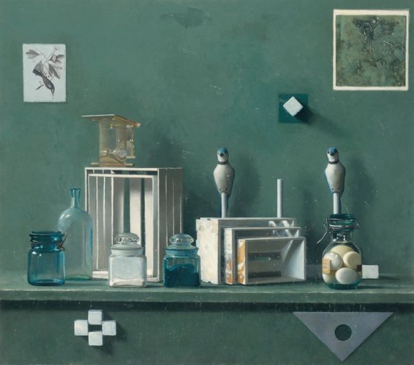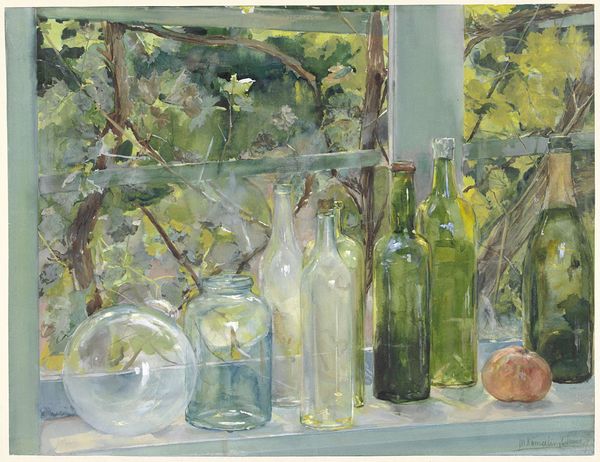 Editor: So, this is *The Usual Suspects* by Melissa Hefferlin. It seems to be a still life created with watercolors and mixed media, depicting various bottles and objects arranged on a table. I'm initially struck by how calming it feels, almost meditative with its muted palette. How do you interpret this work, with its symbolic grouping of items? Curator: That's a perceptive observation. I'm immediately drawn to the recurring theme of vessels – bottles, vases – and how they serve as potent symbols of containment. What do they hold? What do they conceal? The peacock feather, prominently displayed, traditionally symbolizes vanity and pride, but also resurrection and immortality in some cultures. Juxtapose that with the childlike quality of the small figurine. What emotions surface? Editor: I see what you mean about the figurine playing with ideas around innocence! Does the tile fragment suggest some connection to heritage, maybe a kind of broken narrative? Curator: Precisely! Tiles often function as pieces of a larger decorative whole. Perhaps the artist is hinting at fragmented memories or cultural echoes, snippets of a life assembled. The lemon adds another layer – think of its historical association with cleansing and purification. Do you see any sense of tension, maybe between artifice and nature, embodied in these choices? Editor: Definitely! It’s not a direct representation, it’s a symbolic staging. And it sounds like those individual meanings interplay a lot, they aren't rigid, correct? Curator: Exactly. It is through their interplay that this image holds potency. Each element casts light on the others, enriching our interpretation of this intentionally still scene. There is a whole inner world created within, echoing outward. Editor: I learned a lot from unpacking those layers; the symbolism here definitely deepens the experience beyond just surface appearance. Curator: Indeed. Melissa Hefferlin invites us to consider how the mundane objects surrounding us carry echoes of meaning, history, and perhaps even glimpses into our own psyches.