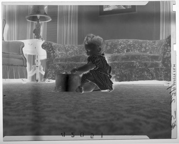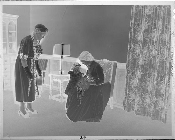 Paul Gittings’s “Untitled (mother leaning in to little girl and birthday cake, blowing on candle)” captures a seemingly universal moment. However, the photograph exists within specific historical and social contexts. Without a date, the image still feels deeply rooted in a certain period, possibly the mid-20th century. The mother's hairstyle, the decor, and even the presence of a formally posed photograph, all point to a particular vision of domesticity and femininity. Looking at the image, I’m struck by how it encapsulates a certain aspiration for middle-class life. The mother’s attention is solely focused on her daughter’s joy. This carefully constructed moment reflects the gendered expectations placed on women during this time. The image’s soft focus creates a sense of warmth, but it also gently veils the labor and expectations inherent in such a scene. Gittings's photograph invites us to consider the complex layers of identity, expectation, and emotion that shape these seemingly simple, intimate moments.