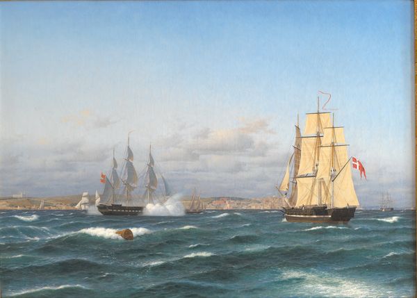 Emanuel Larsen painted "Linieskibet 'Valdemar' krydser Sundet ind for en frisk bramsejlskuling" using oil on canvas. Larsen lived in a time of significant national and maritime pride for Denmark. The Danish fleet, as depicted here, symbolized power and connection in a world navigated by sea. Yet, it's crucial to consider the labor and the lives tied to these ships—the sailors, often from the working class, whose experiences are usually absent from such grand depictions. The painting captures a specific kind of masculinity, one intertwined with duty, adventure, and national service. The Valdemar ship is not merely a vessel; it’s a stage for performing identity, both for those aboard and for the nation it represents. Larsen’s choice to portray the ship in motion, battling the kulning, could be viewed as a metaphor for the challenges and triumphs of Danish identity. This painting invites us to reflect on the narratives of nationhood, masculinity, and labor that are both celebrated and obscured in maritime art.