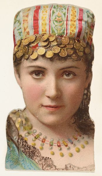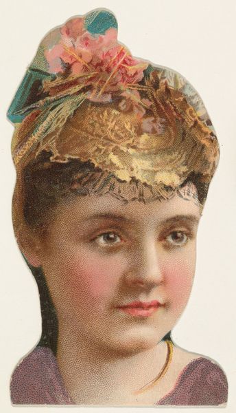 Curator: This print, "Actress wearing leaves at neckline, from Stars of the Stage," created around 1892 by W. Duke, Sons & Co., presents a portrait intended to promote Honest Long Cut Tobacco. What’s your first impression? Editor: It strikes me as unexpectedly intimate. The woman's direct gaze and slight smile, combined with the soft colors, feels like a shared secret, almost an invitation. Curator: Interesting. It was actually part of a larger series designed to capitalize on celebrity culture of the time, distributed within packages of tobacco. The actresses' images, including this one, offered consumers a glimpse into the glamorous world of theater. It’s a very calculated move to create perceived value. Editor: So, it’s all about branding. Looking at it now, it’s also about who gets represented. What were the prevailing attitudes and power structures influencing such images in the late 19th century? Curator: Undoubtedly, these images reflected and reinforced societal ideals. We see an emphasis on beauty, whiteness, and, of course, performativity, aligned with dominant narratives. In her portrait, the subject’s attire, especially the placement of foliage at her neckline, acts almost as a classical reference to mythical or allegorical female figures. Editor: Absolutely. And the “Honest Long Cut Tobacco” adds another layer of analysis, creating tension between feminine purity and commercial vices. In today’s context, where do these portrayals leave women of color and other marginalized actors who may have been sidelined at the time? This portrait isn't just about the surface beauty but rather the systemic patterns around representation. Curator: I agree. Studying ephemera like this portrait allows us to critically reassess the distribution and commercializing of popular imagery. By understanding its roots, we can work toward more responsible visual messaging today. Editor: Precisely, to better reflect and represent the dynamic range of modern identities and dismantle historical bias.