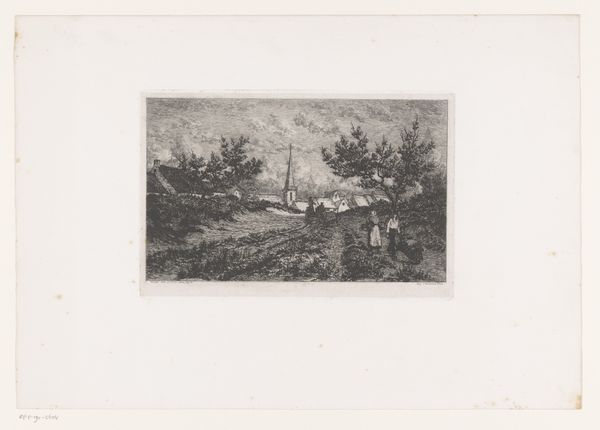 Editor: This is "Dorpsgezicht met landweg in de Kempen" by Frans Van Kuyck, an etching made sometime between 1862 and 1911. The scene feels really still, almost frozen in time. What stands out to you in this piece? Curator: The quiet hum of everyday life, wouldn't you say? It reminds me of childhood summers spent wandering down dusty lanes, each footstep kicking up tiny stories in the air. See how the artist captures the subtle play of light and shadow on the road? It's as if the very air is vibrating with a quiet energy. Editor: Absolutely. The detail in the etching is incredible, but is there more to it than just a pretty picture? Curator: Well, I think that Van Kuyck is capturing a feeling here. There’s a tangible weight to the workers, to the old road stretching toward that village spire. And those spires—they ground you, don't they? But that dirt road tells its own tale of journeys undertaken, of community forged. It’s about human scale in a world increasingly rushing toward… where, exactly? Editor: So it’s not just a scene; it’s a statement? Curator: Every brushstroke, every etched line, my friend, is a whisper from the soul. Don’t you feel a certain stillness emanating from that church? It centers the whole composition, as if life flows out from that place, and also back into it. I am interested, what feeling would you give this piece? A little peace? Maybe awe? Editor: Definitely peace. Thinking about the detail, the time, the message... thanks, I’m seeing so much more now. Curator: Ah, to see more – isn’t that what art is all about? Finding echoes of ourselves in these frozen moments. I felt a nice reflection come over myself just now!