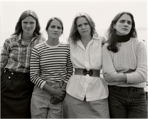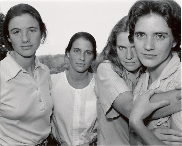 Editor: This is "The Brown Sisters, Woodstock, Vermont," a 1990 black and white photograph by Nicholas Nixon. The composition feels so direct and intimate, given that we’re face-to-face with these women. What are your thoughts when you view it? Curator: For me, the photograph speaks volumes about the intersection of labor, representation, and the very material conditions of everyday life. Consider their clothing: durable jackets, functional layers, all hinting at lives lived close to the land, maybe farming or manual labor. Nixon isn’t just presenting idealized beauty; he’s showing us the texture of lived experience, literally woven into the fabric of their garments. Editor: I hadn’t really considered their clothes in that much detail, focusing more on their faces and the emotional connection. Does the consistency of this series, photographed annually, change the perception for you at all? Curator: Absolutely! That annual ritual transforms it into a document of aging and change. It's not just about capturing a single moment but revealing the relentless passage of time and its effects on both the individual bodies and their collective relationship as sisters. Nixon utilizes photography to materialize time. Does his use of black and white influence your response, as well? Editor: It adds to the timeless, almost documentary feel. Everything is so unadorned, devoid of artifice. The choice to not use color allows us to concentrate on the sisters' evolving appearances across the years. It is also so different from contemporary digital photography, so the "means of production" you mentioned are significant, in this respect. Curator: Precisely! The lack of digital manipulation emphasizes the "real," prompting us to question our consumption of images in an era saturated with constructed realities. A refreshing perspective on both family and photography. Editor: Thank you for this enlightening perspective. Now I have a richer understanding of the artist’s project and what elements might impact its understanding.