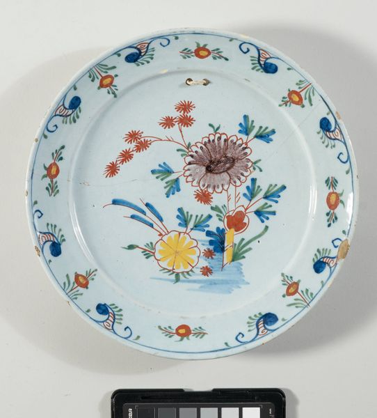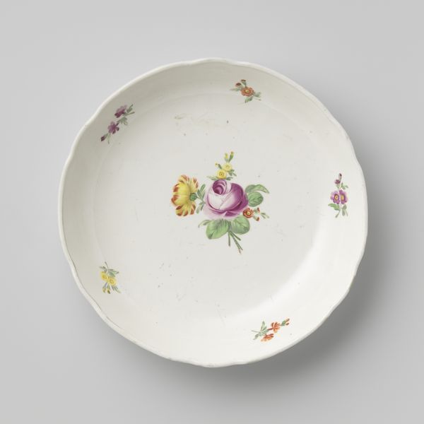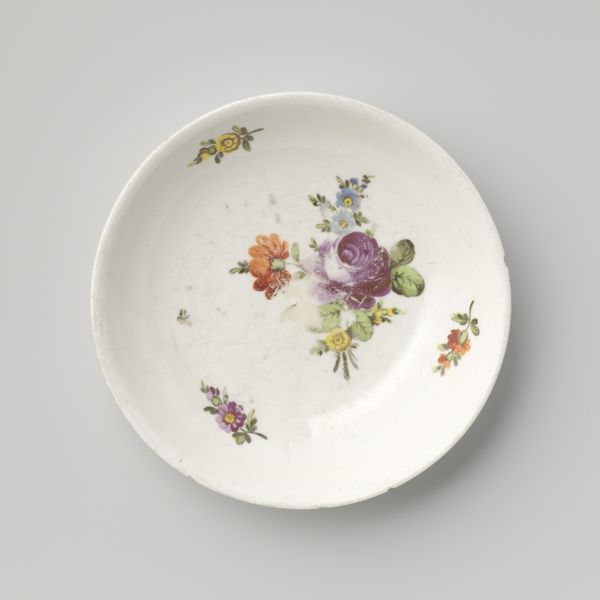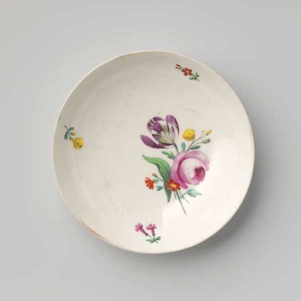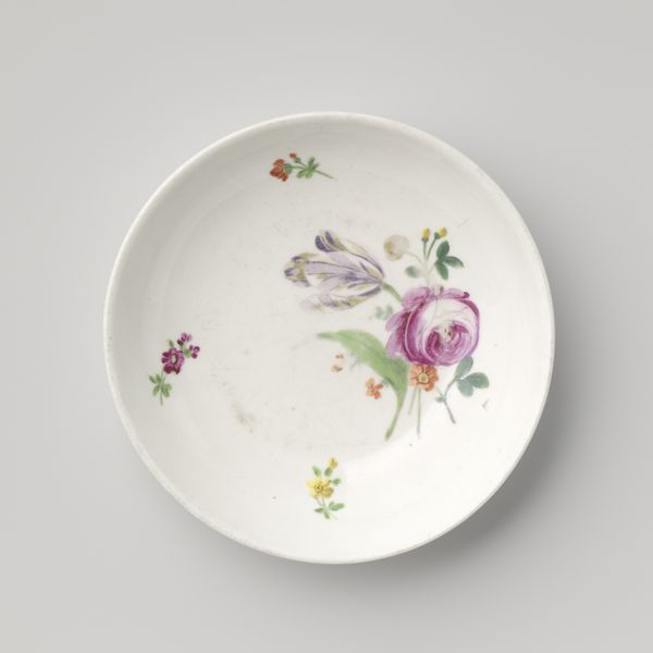 Curator: Before us, we have a delicately rendered saucer. Dating from around the 18th century, it is presented as part of the Minneapolis Institute of Art's collection. Editor: My initial response is how vibrant the colors are. There’s something so cheerful about the combination of reds, blues, and yellows on that pristine white porcelain. Curator: Absolutely. While created anonymously, it encapsulates elements characteristic of its period, and particularly reflects an interesting interplay between global trade routes and artistic interpretation. Considering the style known as Orientalism, what aspects of cultural appropriation might be present here? The floral motifs, for example, may have taken on new meanings through the process of exchange. Editor: The visual composition also catches my attention. The rhythmic distribution of the flowers—the clusters versus the individual blooms—creates a very pleasing visual experience, drawing my eye around the circumference of the saucer. The symmetry gives it a nice balance too. Curator: And further, in what social settings would such an object function? Was it part of a set used in elite circles, or was it accessible to a broader segment of the population? Considering factors of class, trade, and the artistic trends, we are allowed to interpret the symbolic meanings embedded in what might first appear as just simple, innocuous decorative piece. Editor: From a purely formal standpoint, I'm fascinated by the glaze—that smooth, almost glass-like finish—that would feel incredibly smooth and sleek to the touch. The way the colors pop against it makes the surface feel quite lively despite being a simple utilitarian shape. Curator: Precisely. Through a complex understanding of historical forces, aesthetic interpretation, and critical engagement, we enrich our appreciation for an item otherwise dismissed. Editor: Indeed. Analyzing its structural elements encourages an intimate, sensuous awareness of its being, allowing it to speak across time and culture.