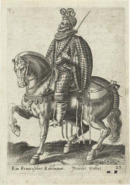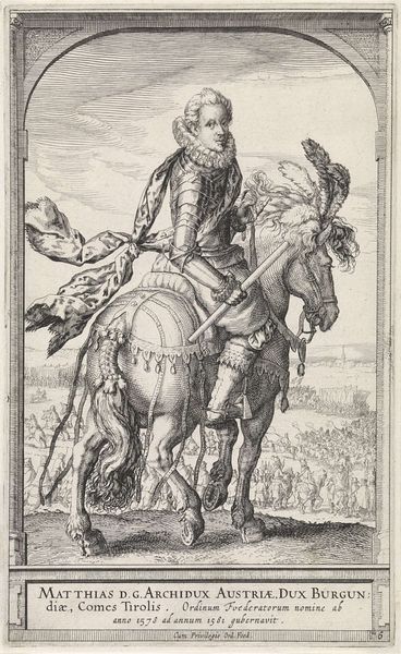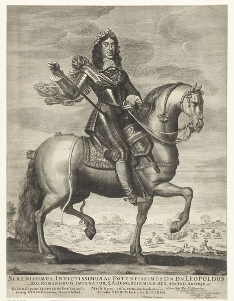 This is a portrait of Charles II, King of England, made by Theodor van Merlen using engraving. The image is defined by the linear quality of the engraved lines, which create a strong sense of depth and texture. Consider the labor involved in producing the artwork. The artist would have painstakingly carved the image into a metal plate, a time-consuming process requiring immense skill. Each line had to be carefully placed to create the desired effect, from the intricate details of Charles II's armor to the majestic horse. This highlights the value placed on skilled craftsmanship during this period. The choice of engraving as a medium also speaks to its accessibility. Unlike painting, engravings could be reproduced and distributed widely, making them an effective tool for disseminating images and ideas. By understanding the materials, making, and context, we gain a deeper appreciation for the artistic skill of the engraver, and the social and political function of images like these.