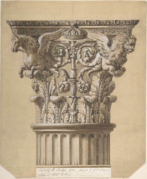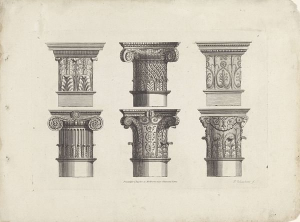 This print of a composite capital, made around 1575 by Monogrammist G.A. & the Caltrop, gives us a look into the labor and skill involved in architectural design during the Renaissance. The print itself is made from ink on paper, a relatively accessible medium, yet it depicts a highly ornate capital, showcasing layers of intricate carving. Notice the acanthus leaves and delicate floral patterns. These details would have required immense skill and time from a stone carver. The print belongs to a series called "Speculum Romanae Magnificentiae", a set meant to document the glories of ancient Roman architecture. The series served as a pattern book, and offered inspiration to builders and patrons. These prints played a crucial role in disseminating classical styles throughout Europe. This print, therefore, is not just a visual record. It is a testament to the collaboration between designers, skilled craftsmen, and the economics that supported such elaborate creations. It reminds us that even seemingly simple images can reveal complex relationships between art, labor, and society.
