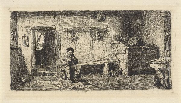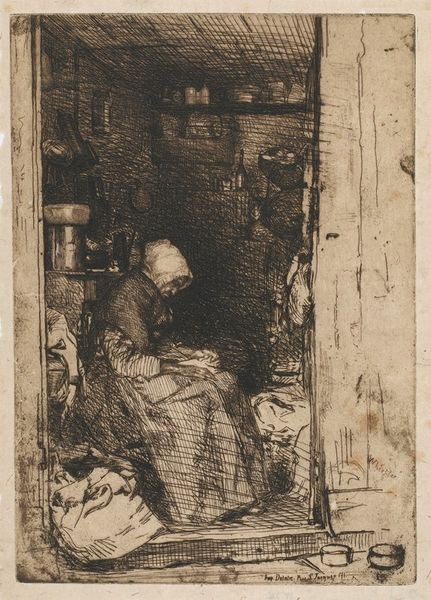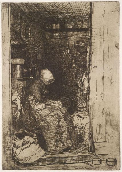 This etching by Bernardus Johannes Blommers captures a quiet domestic scene in muted tones. The composition is structured around a woman seated by an open door, peeling potatoes. The artist uses line and shadow to define form and create depth. Blommers' work embodies a tension between realism and idealization, reflecting broader artistic and philosophical concerns of his time. The figure of the woman, rendered with a mix of detail and generalization, invites us to consider the social and cultural codes at play. Her humble task and setting speak to the realities of working-class life. The open door functions as a semiotic device, suggesting both enclosure and the possibility of escape or connection to the outside world. Note the texture achieved through the etching technique; it adds a tactile quality to the scene, enhancing the sense of lived reality and prompting ongoing interpretation of its cultural significance.