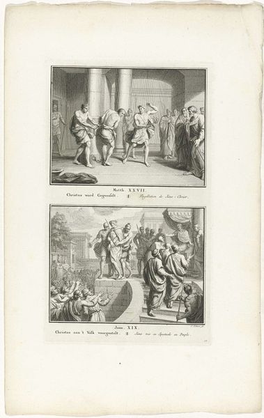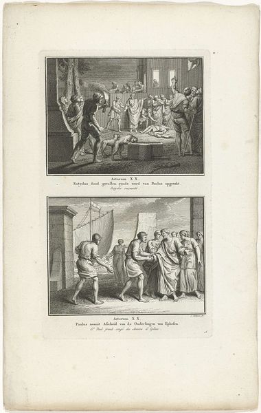 Editor: This engraving, created by Jacob Folkema in 1791, depicts two scenes from the story of Gideon. The details are so precise; it almost feels like I’m looking at a miniature play. The upper scene has an element of tension and judgment; the bottom, of celebration. What historical or cultural elements can you pull from the print's narrative? Curator: It's crucial to consider the role of religious imagery within the broader social landscape of 18th-century Europe. How do you think these images of Gideon being used to uphold specific moral values of the time? Notice the emphasis on military leadership and divine favour – things like selecting troops. How could those images work to legitimize those in power at the time this work was created? Editor: That makes me think about the selection of those fit to serve versus those who lap like dogs; there is a clear implication about who is worthy to serve and what traits might signal that to observers. And in the lower image, the warriors adorn Gideon after slaughtering their foes. Curator: Exactly. It also might make one consider how imagery influences our interpretation of scripture and power. Consider, how did Dutch politics inform how Folkema decided to make his print? Who do you suppose the intended audience might have been, and where would they typically view such a work? Editor: I guess it depends, whether it would have been for individual devotional practices or distributed widely as propaganda to unite groups against invaders. Curator: Precisely. And thinking about the proliferation of prints and engravings… these affordable prints made such narratives available to more people. We shouldn’t underestimate that access, nor how these narratives can reinforce specific social and power dynamics, as well as function to inform individual practices. Thanks, that was revealing. Editor: Thank you. That has changed how I look at it!