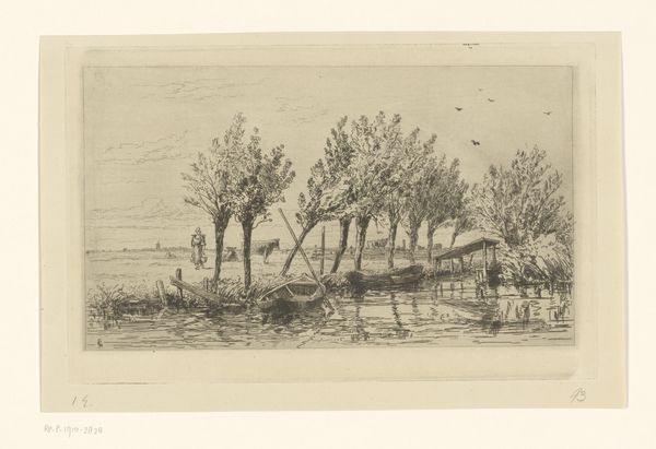 Editor: So, here we have "Landweg bij Warnant," or "Country Road near Warnant," a print made around 1872 by Carel Nicolaas Storm van 's-Gravesande. It's an etching, which gives it this really delicate, almost hazy quality. It feels incredibly quiet and contemplative. What do you see in it? Curator: Ah, yes, 's-Gravesande. For me, this image whispers of windswept days and quiet introspection. Notice how the road isn’t just a path, but a deeply personal, symbolic passage. It seems less about arriving somewhere and more about the journey inward. Have you noticed the subtle figure on the road? It suggests someone making their way through life itself, not just the Belgian countryside. What do you suppose is going through their mind? Editor: I hadn’t thought of it like that, but I see what you mean! There's a real sense of isolation. They seem very small. Perhaps they feel a little lost? Curator: Precisely! And maybe that's where its beauty resides. We, the viewers, become complicit in this intimate, slightly melancholic moment. Does that resonance with the time and movement known as Impressionism? They captured a momentary personal impression of time and landscape. It's almost a conversation with nature. You seem a bit lost too as you ponder a bit longer over this landscape of this solitary journey, hmm? Editor: Definitely. It makes me wonder what my own "road" looks like. I see more depth in the way the trees are rendered now, a contrast between the solid tree on the hill versus the bare tree near the distant river bank... so there are layers of different qualities! Curator: Isn't it wonderful how a simple landscape can reflect so much of ourselves? An etching, in some way, allows you to make that happen. I walk away seeing my own internal map changed ever so subtly with the potential I can have in the external. Editor: Exactly. It makes me appreciate how art can offer this quiet reflection. Thanks!
