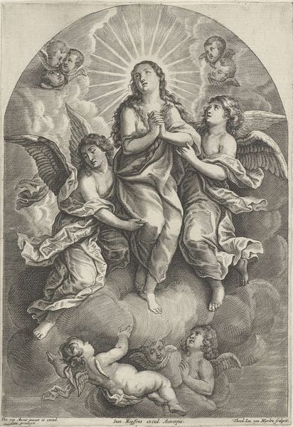 Editor: Here we have Wenceslaus Hollar's "Hemelvaart van Maria," made between 1622 and 1652. It's an engraving, and the image depicts the Virgin Mary ascending to heaven surrounded by angels. I'm immediately struck by the detail achieved with just lines and shading. What catches your eye about this print? Curator: It's important to look at the labour involved in this piece, thinking about the social context of printmaking at the time. How might the widespread availability of prints such as this one have impacted the consumption of religious imagery and the role of the church as a mediator of faith? Consider the tools, the paper, the ink—these materials situate the artwork within a specific network of production and distribution. Editor: So, the material used helps determine the audience and access. Curator: Precisely. This engraving also opens the conversation about the accessibility of art. Think about the relative costs. An oil painting by a master remained unattainable to all but the elite. An engraving, even painstakingly crafted as this was, democratized the image, enabling broader audiences to possess and contemplate these religious narratives. Where does it sit in terms of 'high art' vs accessible commodity? Editor: That’s fascinating! I never really considered how much the medium affects accessibility and consumption. Curator: And don't forget the cultural impact. By reproducing images, prints spread ideas and artistic styles across Europe and beyond. Consider the reproductive nature of the engraving; is Hollar simply copying, or is he intervening artistically? Where does it stand between copy and original? Editor: I guess, knowing that an engraving like this circulated more widely gives me a completely different view of the image and its role in society back then. It’s less about divine artistry, and more about how labor and access shaped religious belief. Curator: Indeed. Looking at it through the lens of materials and distribution highlights how art is fundamentally connected to social, economic, and even religious structures.