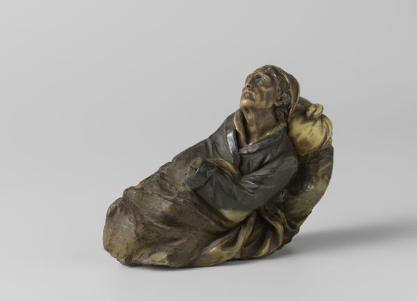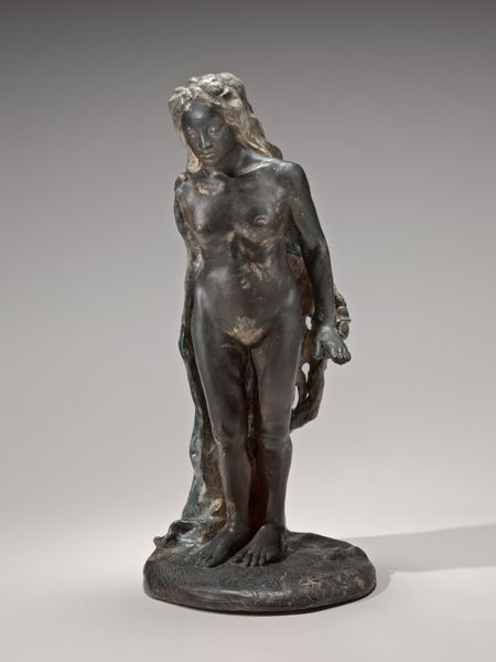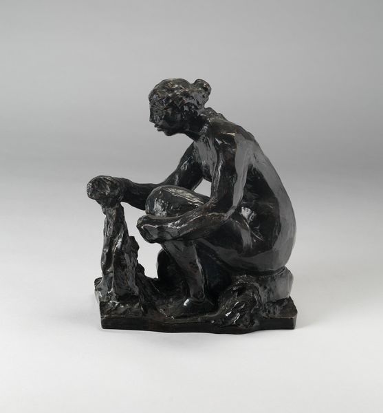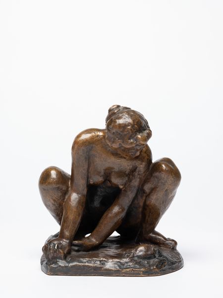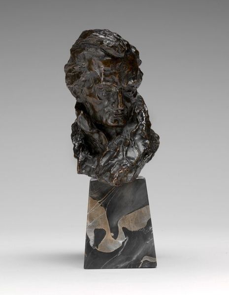 Curator: Here we have "Portrait of a Woman (Mme Albert Bartholomé (?))", rendered in bronze by Edgar Degas, sometime between 1890 and 1920. What's your initial reaction to it? Editor: She seems so...withdrawn. There's this heavy sadness, but it's also strangely peaceful. The dark patina of the bronze deepens that somber mood. The composition, too, with her resting her face on her hand, conveys fatigue or perhaps deep contemplation. Curator: I think that's spot-on. Degas wasn't just trying to capture likeness, was he? The pose speaks to the sitter's internal world, not just her physical presence. The way he's roughed up the surface, left the marks of his hand so evident, that's almost brutal in its honesty. It rejects classical smoothness for something far more psychologically raw. Editor: It's the antithesis of idealization, definitely. You feel like you're looking at a real person burdened by something, or maybe just life itself. And bronze as a medium – we often associate it with commemoration and triumph. Here, it's almost a counter-monument, marking a private, unseen emotion. The lowered eyes have resonated in art for centuries, signaling introspection, a refusal to meet the gaze of the world. I wonder what inner space Degas wanted to reveal here. Curator: Degas was often like that – a rebel within Impressionism. This bust is quite different from his ballerinas, who seem to defy gravity; this woman appears firmly grounded, held down by something intangible. The title gives us so little—only a tentative identification. Maybe this ambiguity forces us to confront the universal experiences of sorrow or resignation. Editor: Right, the uncertainty in the title adds to the mystery. It emphasizes the "woman" over the "Mme Bartholomé," so, perhaps we're invited to see her as an archetype. A stand-in for unspoken emotional realities that echo across cultures and time. Bronze, though fixed and permanent, oddly gives the face a vulnerable feel in how the light interacts with its surfaces. Curator: Exactly! Perhaps, we, as viewers, should reflect more on how these emotional undercurrents connect us. What feelings this portrait evokes within our own history. Editor: What she reminds us of, the universal vulnerability inherent in all living things. I'm grateful that Degas immortalized something as fragile as inner contemplation.