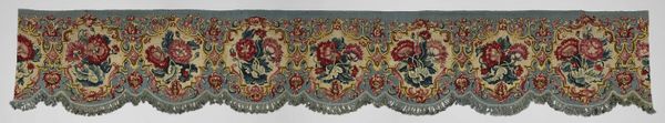 This elaborate textile, a bed valence, was made by Beauvais, the famous French manufactory. It's woven using wool and silk, materials that speak to luxury and skilled craftsmanship. Look closely, and you'll see how the materials dictate the appearance. The silk threads create a subtle sheen, while the wool provides depth and texture. The weavers would have used a low-warp loom, meticulously interlacing threads to build up the design. The density of the weave, combined with the plushness of the materials, gives the valence a weighty, substantial feel. The complex floral patterns and drapery-like effects showcase the expertise of the Beauvais workshop, which employed highly skilled artisans. This kind of piece would have been commissioned for the wealthiest echelons of society, and involved many hours of work. Considering the labor involved, and the social context of elite consumption, we can see this textile as more than just decoration. It's a material record of craft, skill, and social status, blurring any easy distinction between art and design.