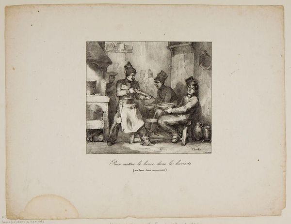 Curator: I see a narrative of compulsion and social pressure here, doesn’t it? Editor: This print by Auguste Raffet is titled "Enough! My friends, but one more draught, I promise." The textures created by the etching are immediately striking, so immediate to the hand, aren’t they? Curator: Absolutely. Raffet, born in 1804, captures a scene rife with the politics of addiction. Note the power dynamics at play in the seemingly convivial atmosphere, reflective of broader social inequalities. Editor: And how the process itself—etching—demands a repetitive, almost compulsive action, mirroring the very subject it depicts. The labor involved in creating this image echoes the daily grind of those within it, their reliance on materials for solace. Curator: Precisely. It's about the intersection of class, addiction, and the performative aspects of masculinity. The "promise" in the title seems laced with societal expectations and pressures to conform. Editor: Yes, the consumption of the etching materials—acids, plates—to produce this commentary on consumption is ironically compelling. A stark reminder of the cycles of production and decay in both art and life. Curator: I agree. This piece, seemingly about a simple gathering, is actually a complex reflection on social structures and individual agency. Editor: Right, seeing it this way allows us to contemplate how such methods and materials contribute to the artwork’s message and affect.