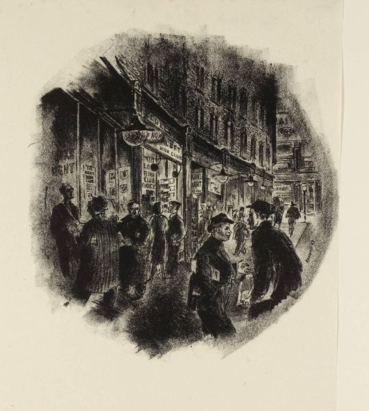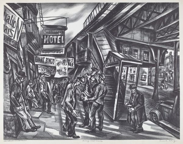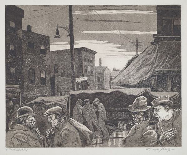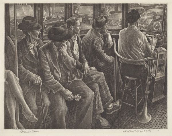 Editor: So, this is "3 A.M.," an etching by Isac Friedlander from 1934. Looking at it, I'm struck by how weary everyone seems. The composition is dense, filled with slumped figures. What do you see in this piece, beyond the obvious exhaustion? Curator: Well, beyond the fatigue—which is palpable, isn't it? You can almost feel the grit of the city in your eyes just looking at them. I see a snapshot of resilience. Friedlander, working during the Depression, captured something raw about urban life. It is late; people are tired. But they are going home, onwards. Does it feel timeless, do you think, despite the fashions? Editor: Absolutely. The image of waiting – be it for a bus, train or a new job – feels so relevant today. I notice how Friedlander uses light and shadow. There is harshness but also softness that underscores the vulnerable state of the people portrayed. Were artists at the time focusing on the social conditions a lot? Curator: Indeed. There was a keen interest, especially within the Ashcan School, in depicting the everyday realities of urban life. It’s fascinating to see how artists like Friedlander chose etching, a very detailed process, to capture these seemingly fleeting moments. It elevates the mundane to something monumental. What do you take away from how this moment has been immortalized? Editor: That's powerful—the elevation of the everyday. I now appreciate how the medium and composition combine to create an image that’s both stark and deeply human. The careful etching seems to honor each weary face. Curator: Exactly! We find beauty, meaning, and resonance in unexpected places. This etching becomes a quiet testament to human perseverance. And, it speaks of those small moments we don't think to note; all of us, traveling, waiting to arrive "home".