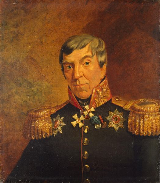 Curator: The eyes! They really pull you in, don't they? A piercing gaze. Editor: They do. This is George Dawe’s *Portrait of Ivan Shakhovskoy*, painted in 1825. The social context is key here: Shakhovskoy was a major general during the Napoleonic Wars, and this painting captures a particular moment in the construction of Russian national identity in the wake of that conflict. Curator: Yes, absolutely. Look at the way Dawe emphasizes the awards and decorations on his uniform. It speaks volumes about status, power, and service to the empire. Beyond that though, what do you think about his likeness? Editor: He seems every bit the Romantic hero, doesn’t he? The slightly dishevelled hair, the determined expression... I imagine that it served as a tool to portray masculinity and political ideologies. It feels so performative. Curator: You're right, there is definitely a construction of masculinity on display. It also serves as an indicator of class. This type of romantic portraiture in 19th-century Russia played a key role in how the aristocracy wanted to be seen. There is tension between the glorification of his military achievements and a softening effect with the play of light on his face. Editor: And Dawe was quite the celebrity portraitist in his own right, deeply entwined with the Russian court at the time. He didn't just record likenesses; he shaped them for public consumption. The public and private personae of powerful figures were carefully managed through art, it makes me wonder about Shakhovskoy's private life. Curator: It makes one consider his position in society beyond being an acclaimed military general. As we reflect on the artwork, it becomes apparent that portraits like these weren’t simply about appearances but are tied to political history and identity in that era. Editor: Yes, indeed. The dialogue this work inspires makes clear how the romantic artistic values were in constant conversation with societal forces at play, allowing us to read how political ideals and identities take shape, in his life and in ours.