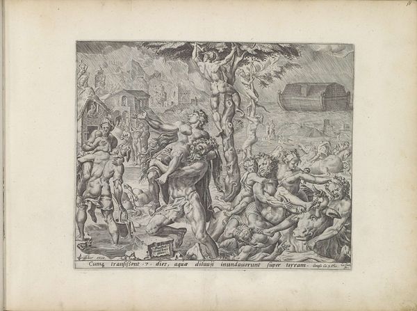 Curator: Oh, wow, it feels…claustrophobic, doesn't it? All that churning detail. Like a bad dream. Editor: Indeed. What we’re looking at is “The Deluge,” a 1559 engraving and etching by Cornelis Cort. It’s currently housed here at the SMK, Statens Museum for Kunst. What's striking immediately is the density of line and form, characteristic of Mannerist prints. Cort has crammed every square millimeter with frantic activity. Curator: Crammed is right! You've got people clinging to each other, scrambling up trees… Is that someone riding a bull? It’s like everyone’s been caught completely off guard by the world ending. It makes you wonder about that moment right *before* panic sets in, you know? Did they laugh? Argue? Ironize, even? Editor: The composition certainly reinforces that sense of chaos. See how the figures are arranged in a swirling vortex, leading the eye upward? Cort uses the rising water level, subtly suggested, to compress the figures vertically. Note also his use of strong diagonals to fracture the pictorial space—nothing is stable. And he smartly emphasizes light and dark to highlight the horror: Observe the dramatic play of light on the desperate figures against the impending doom in the background. Curator: You know, thinking about it…there's something beautiful about it, too. About how interconnected everyone is in their terror. They're all holding onto each other, quite literally. The desperation actually sparks… what's the word, collective spirit maybe. Also notice the architectural structures? Editor: A valid point. Consider this not just as a depiction of suffering, but also an allegorical study on divine justice. It uses Mannerist style, of course, which loved this kind of highly stylized, somewhat artificial emotionality. Notice how elongated and muscular figures can convey maximum emotional intensity. In some ways, it's theatrical… a performance of grief and terror. But there is beauty there, in both technical skill and the sheer human energy. Curator: Well, Cornelis Cort has certainly given us a lot to chew on—a flood of detail both terrifying and, strangely, beautiful. Editor: Agreed. An unsettling piece but the more we examine it, the more complexities are revealed in this fascinating example of Mannerist printmaking.