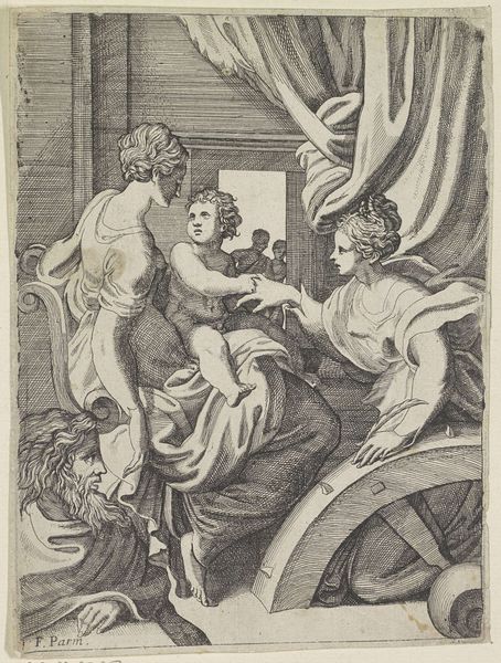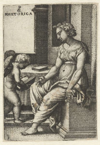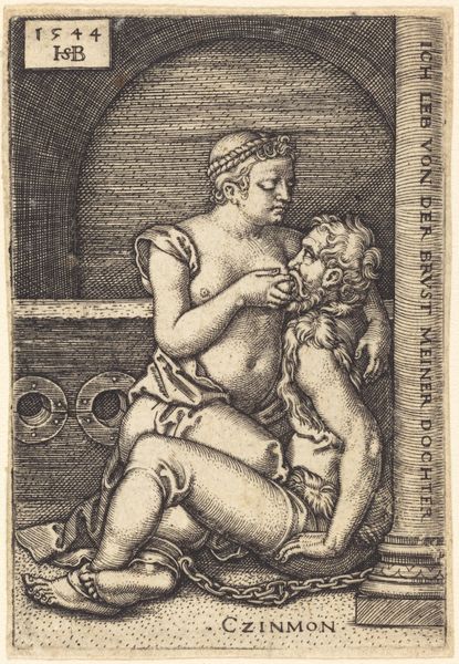 Curator: Sebald Beham's engraving, "Pero zoogt geketende Cimon in gevangenis," created in 1544, presents us with a curious scene, doesn’t it? Editor: Yes, my first reaction is a sense of disquiet. There’s a certain starkness in the composition that speaks to the fraught dynamic at play here—confinement and desperation are quite palpable. Curator: Indeed. Beham’s masterful use of line creates strong tonal contrasts, effectively emphasizing the forms of the figures. Note the architectural backdrop composed of these rounded archways, seemingly hemming them in. Editor: This is such a compelling Renaissance artwork and is based on a story illustrating Roman "caritas." Pero sustains her imprisoned, starving father, Cimon, with her own breast milk. It powerfully evokes themes of sacrifice and female agency within patriarchal structures. Curator: From a formal perspective, notice how the curves of Pero's body echo those arches, creating a visual harmony but also a sense of enclosure. The use of light and shadow directs the eye, making Pero's act all the more intimate. I find it's very successful as an artwork. Editor: But let's consider the socio-political dimensions of this portrayal. Pero’s selfless act of transgression exposes not only her personal rebellion against authority but serves as a condemnation of inhumane justice. By providing her body, she reclaims agency from those attempting to dehumanize her father. Curator: Certainly. And while the engraving might read as a testament to a daughter’s devotion, one cannot ignore the artist’s delicate use of line and shadow to emphasize the texture of skin and folds of fabric that lend sensuality to what is ultimately, I would say, an act of survival. Editor: I concur, however that in reclaiming these narratives through feminist interpretation, we can excavate previously dismissed contributions by female and queer artists, disrupting long-standing biases in art history. Curator: It makes me think of what impact a viewer in 1544 would think looking at this work in real time, considering the themes and subjects available to them. It must have had an entirely different message. Editor: Ultimately, Beham's piece becomes a springboard for exploring intersectionality, gender, power, and the politics inherent in human relationships, resonating through centuries and offering many perspectives to unpack and interpret.