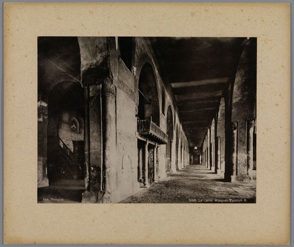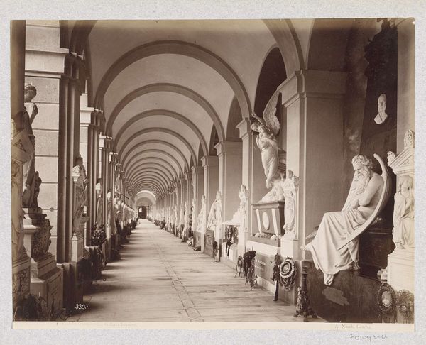 Curator: This photograph, entitled "Gang met geweien in één van de gebouwen van Schule Schloss Salem," roughly translates to "Hall with antlers in one of the buildings of Salem Castle School." It was created around 1929 by an anonymous photographer. Editor: It's like a scene from a very stylish horror movie, all high contrast and disappearing perspective. That tunnel effect is amazing. I wonder, do you think those antlers are real, or did someone just have a wicked sense of humor? Curator: The use of antlers as decorative trophies has a very long history across cultures. Here, within the school, they might represent a connection to nature, a romanticized view of hunting, or perhaps even assert the school's status and heritage. Notice how they're symmetrically spaced and mounted; that formal repetition is crucial. Editor: The formality makes the slightly creepy factor go up tenfold! It's the lighting, I think; each alcove a sort of mini-stage for... well, for death. Even those cupboards on the right are shrouded, giving a shadowy, theatrical vibe to what could have been a nice corridor. Curator: And it’s worth noting, in the early 20th century, many private boarding schools were invested in specific visions of character development. The inclusion of traditional symbols like hunting trophies could reflect attempts to instill particular virtues and values tied to history or region. Editor: Maybe. Or maybe it was just an old castle and they thought, "hey, gotta put these antlers *somewhere*." It strikes me that you're also seeing order imposed, and that makes a huge impression. You are compelled to move along to see if the sequence repeats forever. But maybe the reality of the hall itself had some real bearing on its aesthetic function. Curator: Certainly the building itself, Schule Schloss Salem, plays a huge role in the photograph's symbolic resonance. Salem was founded with the intention of shaping minds, and the architecture surely was part of that plan. This composition frames not just a corridor, but the passage through an environment designed for social training and knowledge. Editor: Right, this isn’t just a hallway, it's a meticulously crafted message. All the light, those orderly arches. You can’t help but feel pulled in; even with no people, it gives me the strange feeling of being observed and also drawn towards the light and perspective offered by this photographic perspective. I bet you’d get fantastic exercise. Curator: This anonymous photo preserves more than just a physical space; it offers a layered narrative of tradition, institutional ambition, and cultural symbolism, and of course, an imposing display of nature adapted to the needs of human life. Editor: I like how those layers keep hinting at all that lurking just out of sight in its depths! That's some serious atmosphere. I definitely know I'd hesitate walking through it alone at night, photograph or no photograph!