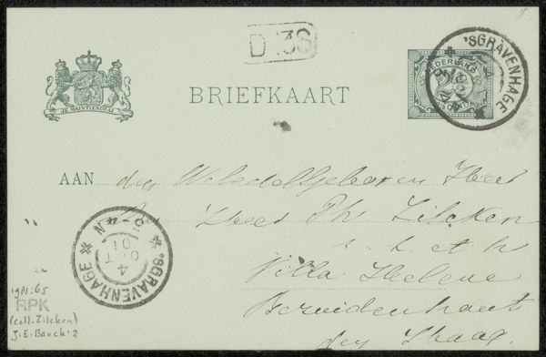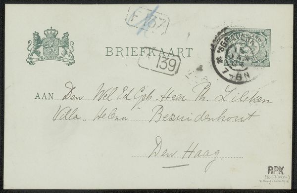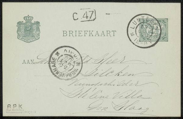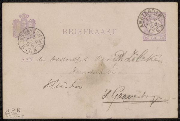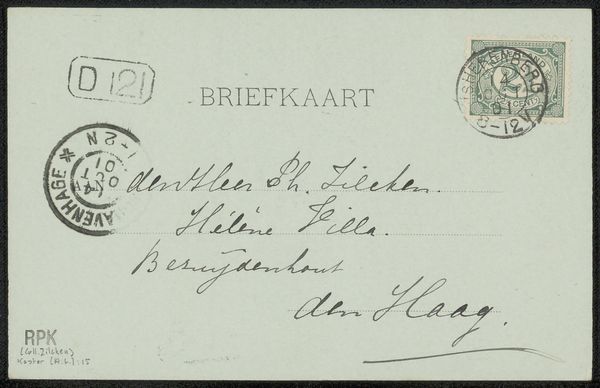 This is "Briefkaart aan Philip Zilcken" by Simon Moulijn, a vintage Dutch postcard, probably made with ink on paper. It’s less about grand gestures and more about the quiet intimacy of a handwritten note. I am immediately drawn to the handwriting, the ink a faded greyish black, looping and swirling across the card. Each letter feels personal, a little dance of the pen. See how the letters almost lean into each other, creating a rhythm that's both formal and casual? It's like the artist is thinking out loud, letting the words spill onto the page. The materiality is so direct—the slightly rough texture of the card, the way the ink bleeds ever so slightly into the paper. You can almost feel the hand that wrote it. This reminds me of artists like Cy Twombly, who embraced the raw, unfiltered mark-making in their work, pushing against perfection. It’s a reminder that art doesn't always have to be polished; sometimes, it's the imperfections that make it real.