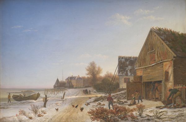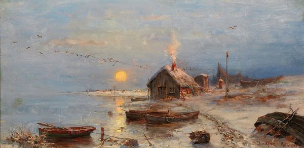 Julius Sergius Klever painted this scene of a 'Homecoming at Sunset' with oils, though when exactly remains a mystery. The blending in this artwork suggests a process of layering, where colors are gently merged to capture the subtle gradations of light and atmosphere. The texture here is really built up isn’t it? Look at the impasto, especially in the snow-laden roofs and the clouds. Klever’s use of thick paint evokes a sense of weight and substance. It makes the scene feel almost touchable. The way he uses the orange and yellow hues, bleeding into the snow, gives the impression of the sun's warmth beginning to thaw the landscape. That winding path, carved into the snow, leads the eye and the imagination deeper into the scene, past the figure making their way towards those warm, inviting homes. It reminds me a little of Pissarro, not in the technique, but that same feeling of serenity, of finding beauty in the everyday. I like that it leaves space for us to wander.