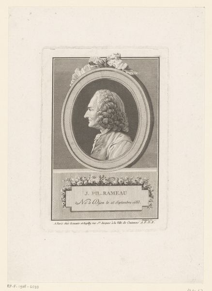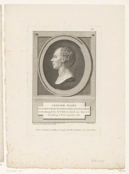 Curator: This work, residing here at the Metropolitan Museum, is Augustin de Saint-Aubin's "Portrait of De Larive," crafted around 1785. It's an engraving, etching, and print depicting its subject in profile. Editor: Hmm, it has this austere elegance, doesn’t it? All that gray makes me feel like I'm looking at a faded memory. The tiny lettering at the bottom, all so precise...gives it this intellectual coolness. Curator: Absolutely. The context is crucial here. This piece emerges from a period of shifting social structures in France. Representing De Larive, a noted actor, points towards the increasing celebrity culture of the time. His profession is, in essence, being legitimized. Editor: Yes, the way he’s framed like a medal, almost, as if for valor, yet with those frilly curls…It's like a paradox, isn’t it? How does this very formal presentation fit a person whose job it is to be emotive? Curator: Exactly. We can think of it through the lens of performativity and the construction of identity. De Larive’s 'virtuous citizen' persona is crafted not just on stage, but also through these very deliberate representational strategies in print culture. It mirrors how the elite used portraiture to convey status. Editor: Which makes you think—was this a commissioned piece meant to control the image of the actor and assert that refined role, in an era on the cusp of revolution? Curator: It’s very possible. Examining prints like this is essential for understanding how power and persona were negotiated and disseminated. The piece also gives us an important intersectional perspective regarding artistic innovation through intaglio alongside emergent celebrity culture. Editor: All that detail… Makes you want to know what De Larive himself would think of all these layered meanings. Would he be amused, annoyed, completely baffled? I love thinking about those sorts of conversations that never quite happened. Curator: That interplay, the lived experience of both artist and subject interacting with a broader cultural narrative—is a rich point of reflection, reminding us that our perspectives continually shape art. Editor: So, looking at it now, knowing a little bit more of the background, the faded gray is alive and full of those ghostly echoes from the past...and it really invites a closer look.