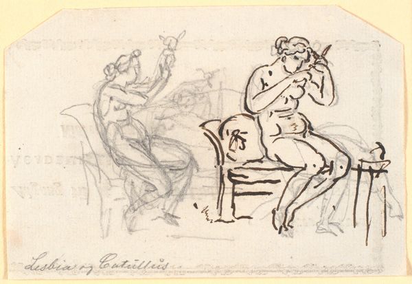 Curator: Here we have a pen and ink drawing entitled “Hvilende Venusfigur, omgivet af seks putti, der leger med sværd, pil og hjerte,” created between 1623 and 1678 by Jürgen Ovens. Editor: It's playful, almost chaotic. The scene bubbles with youthful energy, though the slumbering Venus provides a strange, contrasting calm at its center. There’s something unnerving about her vulnerability surrounded by the cherubic figures. Curator: Indeed. These putti are certainly engaging in the traditional association of Venus with Cupid. Though notice, they aren’t simply innocent depictions of love; some wield swords and others torment hearts with arrows— a complex interpretation that moves beyond simple depictions of love. It also reflects the baroque sensibilities in its dynamic composition, high contrast, and emotional intensity. How does it connect with the period for you? Editor: It draws my eye toward process, certainly. Considering the time period, the crafting of ink would’ve been tied to its material reality: its base components, production of materials, trade and labour. I wonder where Ovens sourced it from, how easy the components to hand and where did his artistic license begin within the frame of economic limitations or accessibility to resources. Curator: The context certainly allows a different lens: the historical positioning of Venus in art through history, always as a political symbol – I’m inclined to think about the access, privilege and wealth granted to the artists of these types of pieces: particularly their ties to specific networks that informed this canon. Who did depictions of women truly speak for? Editor: Good point! By considering who can make and create, as well as where materials originate, it also sheds light on who can not and, crucially, asks us about accessibility within creative labour Curator: Absolutely, it prompts us to investigate not just the beautiful surface of mythological art, but to question who the power players were behind these commissions, what narratives they sought to reinforce or undermine, and what we, as audiences, risk overlooking if we don’t approach the work with those questions in mind. Editor: Seeing Venus represented in this raw medium is such an experience! So often the attention rests on aesthetic enjoyment rather than appreciating where things begin, with their composite parts and components of design. Thanks for expanding that scope!