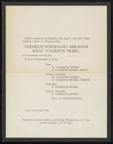 Editor: This is an obituary notice for Johannes de Mare, likely from 1889. It’s a printed document on what looks like aged paper, maybe even a textile-infused paper. The typography is so formal and ornate. It’s kind of a somber yet intriguing piece. What do you see in this work? Curator: I see layers of cultural memory embedded in this seemingly simple printed announcement. Beyond its immediate purpose of informing, it echoes the 19th-century’s intricate dance with death and remembrance. The exhaustive list of names preceding the announcement–that litany of relatives–it's less about familial bonds and more a performative recitation of social status and intertwined family lineages. Editor: So, the text isn’t just information; it’s a social statement? Curator: Precisely. Consider the phrase "Priez Dieu Pour Lui!" It encapsulates a collective cultural and spiritual reflex, where public mourning and piety are intertwined. This wasn’t just about individual grief; it was a demonstration of communal faith and adherence to societal norms in the face of mortality. Even the texture of the paper becomes part of the message; it evokes ephemerality, memory, and perhaps even echoes mourning textiles or religious relics. What does it bring up for you personally? Editor: It makes me think about how even the way we announce death changes so much with the times. Now everything's online and instant. We've lost a lot of that ritual formality. Curator: Indeed. The symbolism here reminds us how deeply ingrained such customs once were. It provokes questions about what remains of these rituals and what new forms of remembrance we've adopted. It's a cultural touchstone, inviting reflection on memory and loss across time.