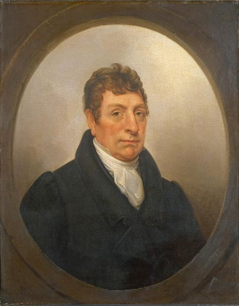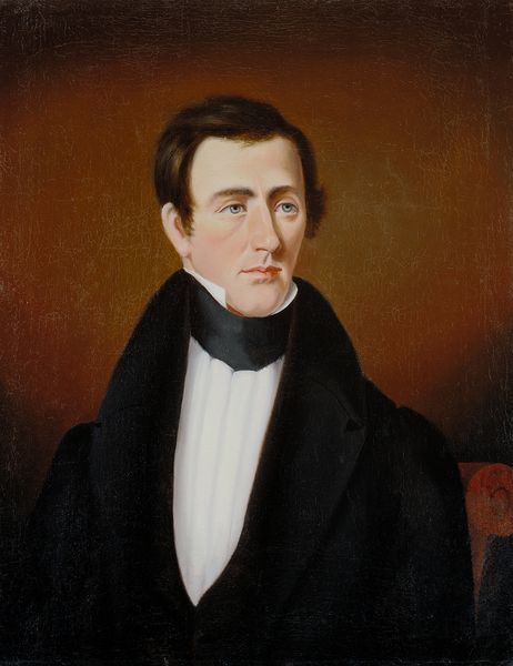Editor: So, this is "Biel Le Doyt," painted in 1827 by Erastus Salisbury Field. It's an oil painting, quite a striking portrait. It almost has a stoic quality. What do you see in this piece? Curator: What immediately strikes me is how this portrait functions as a representation of early 19th-century American identity. The subject's attire and demeanor reflect a rising middle class seeking to establish itself through symbols of respectability and civic virtue. Notice the emphasis on presenting a clean, almost idealized image, yet consider whose stories aren't being told. Editor: You mean how portraiture often excludes marginalized communities? Curator: Exactly. The painting acts as a kind of cultural gatekeeper. But also, consider Field's role as an itinerant artist; How did this dynamic between artist and sitter reflect social power, negotiations of status and influence? Did this individual commission the work, or was this work meant to signal a particular status? Editor: It's fascinating how one portrait opens up questions of representation, social standing, and power dynamics. Curator: Yes, and thinking about these historical contexts allows us to challenge assumptions about who is represented and whose stories get told. It really invites us to interrogate the narrative that early American art often presents. Do you think that the almost stern expression can be seen as performative, indicative of an attitude or posture that the sitter felt was required to be taken seriously by society at the time? Editor: Yes! Thinking about it now, it very much gives an attitude, maybe even something forced! It's something I wouldn't have picked up myself. Thank you. Curator: Of course! Considering these perspectives certainly enriches our experience and understanding of art.