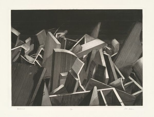 Evan Summer made this intaglio, Nocturne IV, and straight away I’m seeing a process. Look how the geometry of forms creates a tension between chaos and order, like a cityscape in the process of being built or dismantled. The real beauty for me is in the surface. It’s all about the cross-hatching, the layering of lines that build up the tones. These lines, they're not just describing form, they're creating texture, a tactile sense of depth. See how the light catches the edges of those forms. It’s almost sculptural, like a low relief carving. I keep wondering what tools were used, how was the copper plate worked? Was it with a burin, or acid? You can get lost in the details here, each mark telling a story of its making. There’s an echo of Piranesi in the scale and drama of this print, but also something very contemporary in its abstraction. Is it a building? A ruin? Or just an exploration of form and light? Maybe it’s all of those things at once.