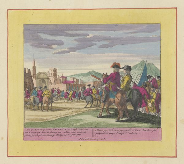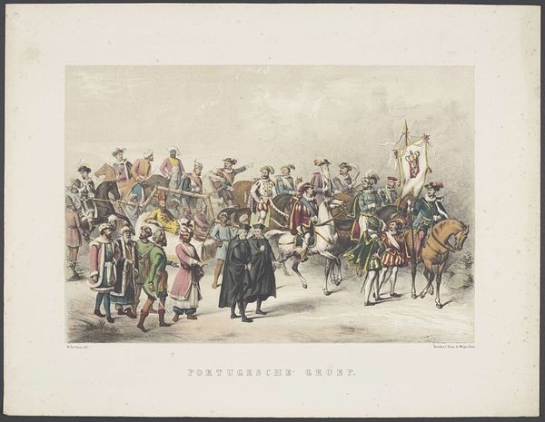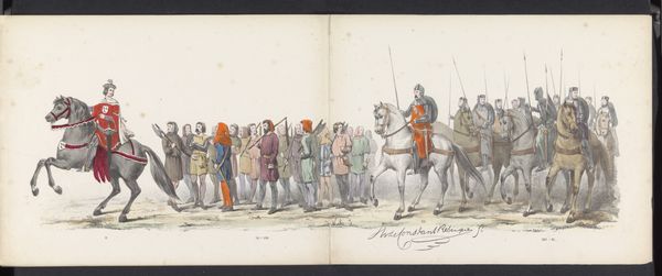 Editor: Here we have "Coronation of William IV, 1831", dating from 1831-1839 by John Doyle, currently housed in the Rijksmuseum. It’s a watercolour… and my first impression is one of, almost satirical observation, a street scene perhaps. The figures seem stiff, self-conscious, parading for an audience that isn’t really there. What do you make of it? Curator: Satirical, yes! Doyle's watercolours are brimming with keen, insightful social commentary; He's a bit of a playful rogue with a paintbrush! It is a street scene; it is a procession and yet something feels ‘off’, doesn't it? Perhaps it's the somewhat amateurish execution. Doyle's strength lies not in painterly skills, but in how sharply he can observe the quirks of human behaviour, in the almost comical way that status is performed here. Editor: You’re right. There’s almost a caricatured element to their pomposity! And the watercolour, being a very light medium, creates a slightly detached, reportage kind of feel. I hadn't quite picked up on that satire, but now I definitely see it! Curator: Precisely! Doyle seems to have been something of an outsider looking in, using his art to cast a wry eye over the societal performances he was witnessing. It is all about appearances isn't it. Almost performative. He doesn't miss a trick! The contrast between the seriousness of the occasion and the slight awkwardness of the subjects – wonderful. And do note that the medium -watercolour- almost adds to the air of something incomplete or impermanent... fleeting... Do you see that too? Editor: Absolutely. Thanks to you, I see so much more in it now than I did at first glance. The satirical undertones really come to life! Curator: It's like Doyle whispers, “Look closely…it's all just a bit absurd, isn't it?”. Which perhaps says more about human nature than Royal Coronations themselves!